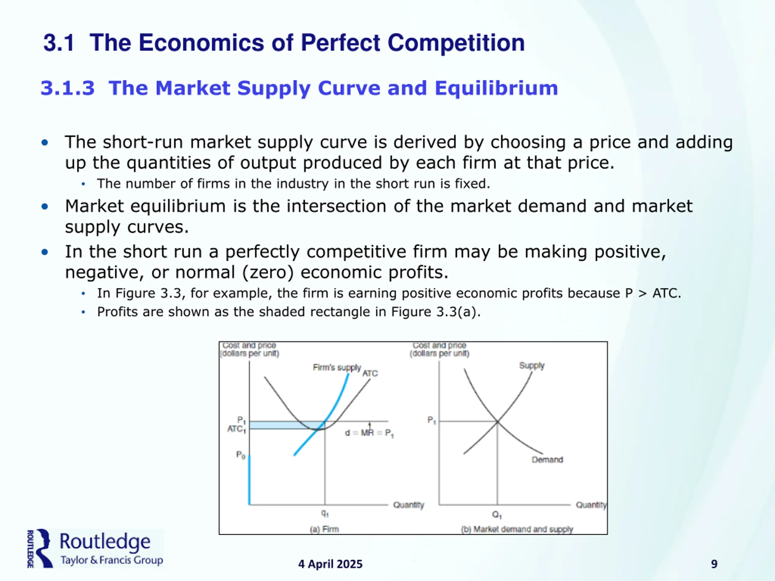 3.1 The Economics of Perfect Competition 3.1.3 The Market Supply Curve and Equilibrium The short-run market supply curve is derived by choosing a price and adding up the quantities of output produced by each firm at that price. The number of firms in the industry in the short run is fixed. Market equilibrium is the intersection of the market demand and market supply curves. In the short run a perfectly competitive firm may be making positive, negative, or normal (zero) economic profits. In Figure 3.3, for example, the firm is earning positive economic profits because P > ATC. Profits are shown as the shaded rectangle in Figure 3.3(a). 4 April 2025 9