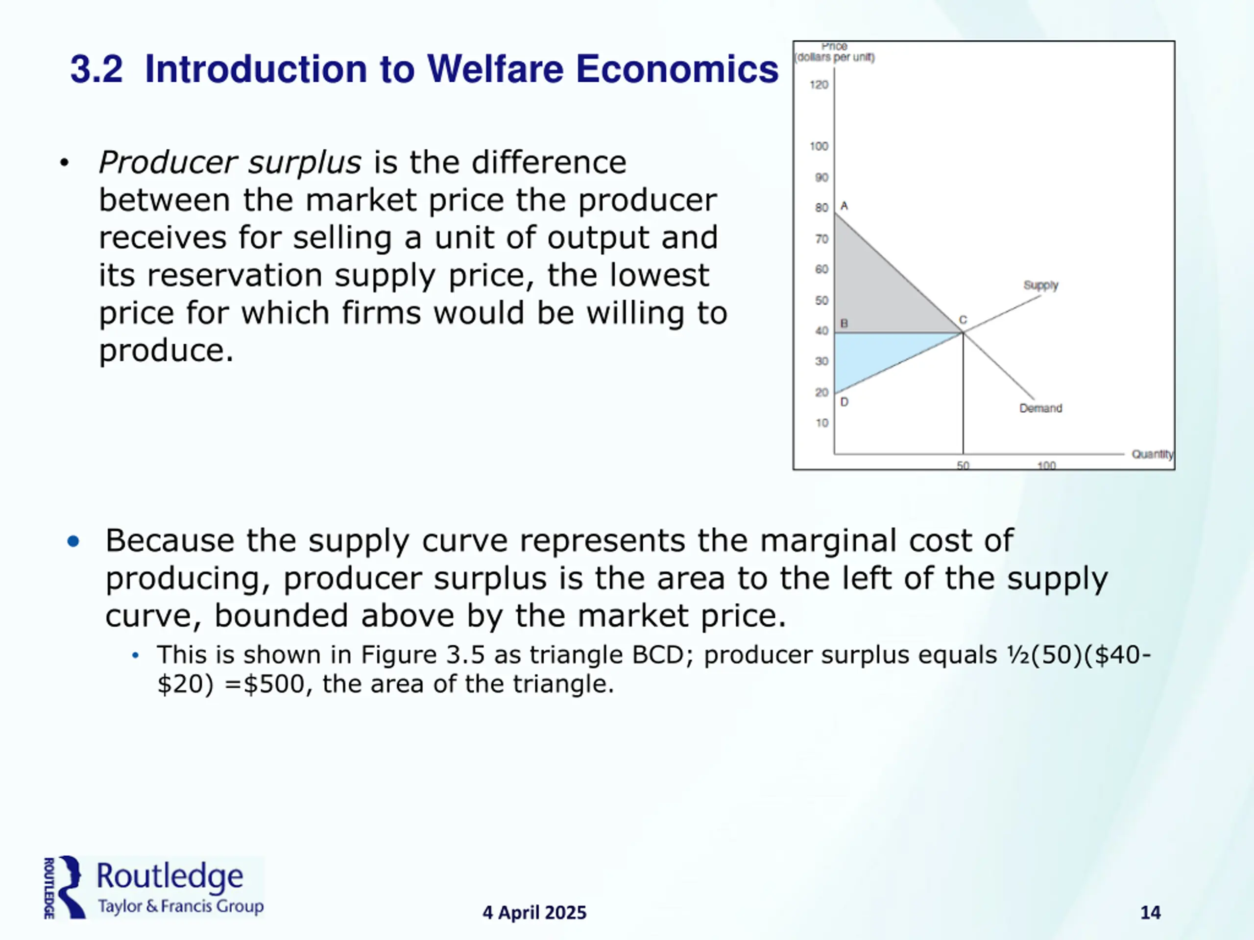 3.2 Introduction to Welfare Economics Producer surplus is the difference between the market price the producer receives for selling a unit of output and its reservation supply price, the lowest price for which firms would be willing to produce. Because the supply curve represents the marginal cost of producing, producer surplus is the area to the left of the supply curve, bounded above by the market price. This is shown in Figure 3.5 as triangle BCD; producer surplus equals (50)($40- $20) =$500, the area of the triangle. 4 April 2025 14