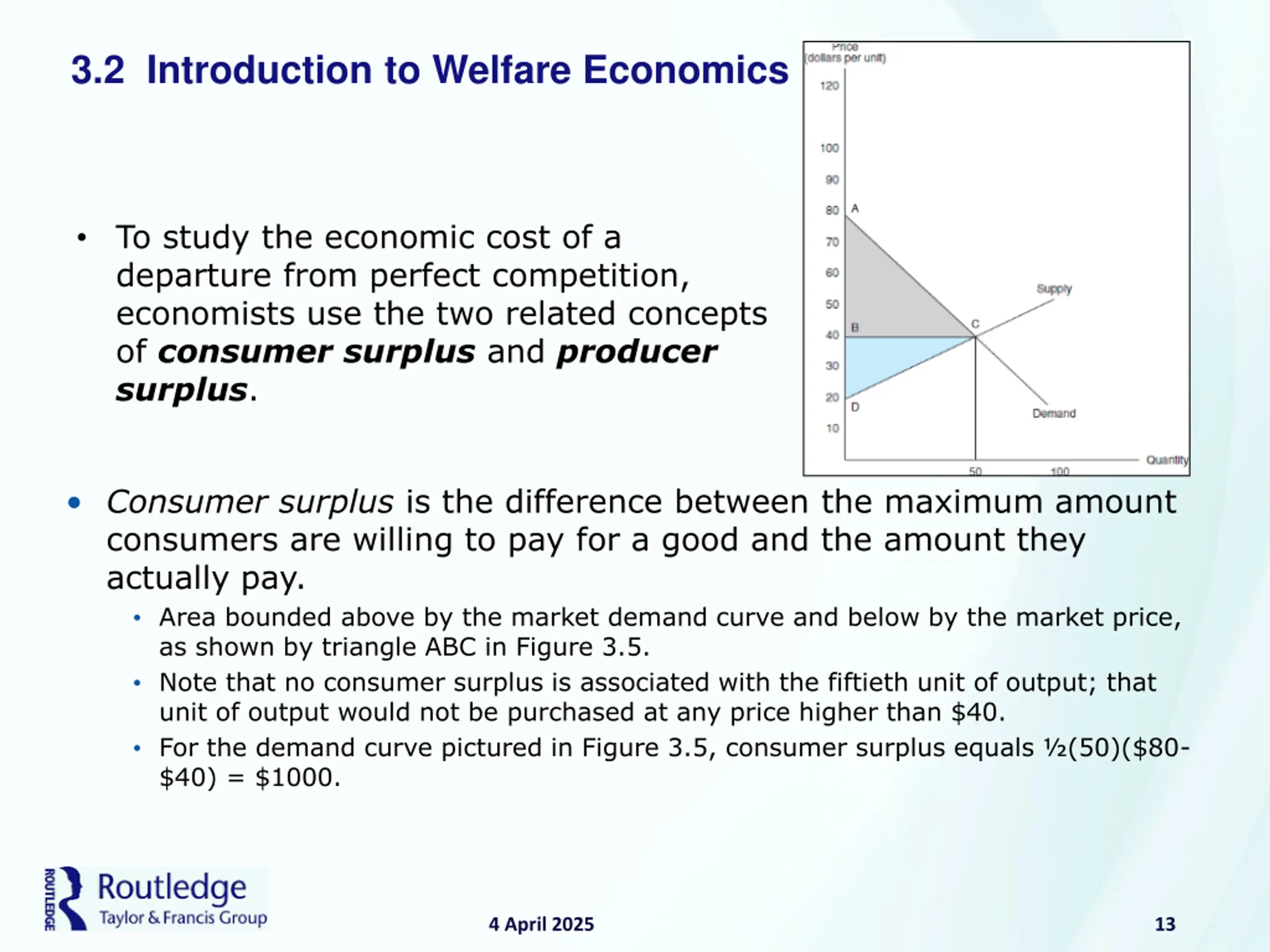 3.2 Introduction to Welfare Economics To study the economic cost of a departure from perfect competition, economists use the two related concepts of consumer surplus and producer surplus. Consumer surplus is the difference between the maximum amount consumers are willing to pay for a good and the amount they actually pay. Area bounded above by the market demand curve and below by the market price, as shown by triangle ABC in Figure 3.5. Note that no consumer surplus is associated with the fiftieth unit of output; that unit of output would not be purchased at any price higher than $40. For the demand curve pictured in Figure 3.5, consumer surplus equals (50)($80- $40) = $1000. 4 April 2025 13