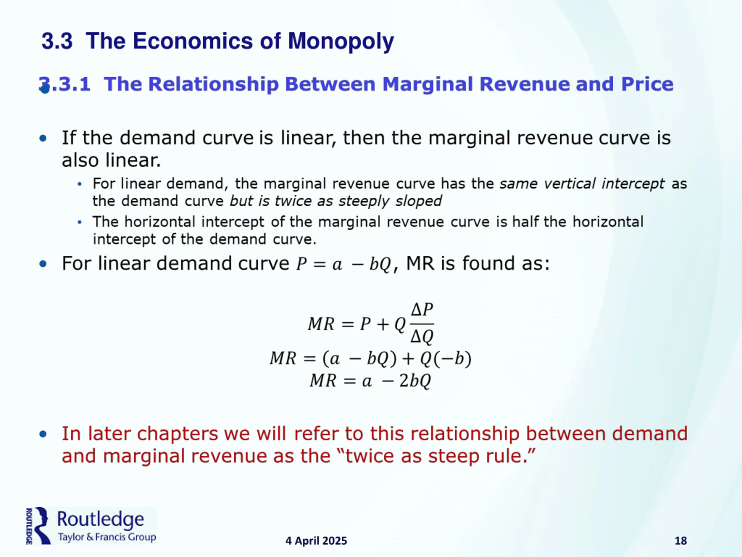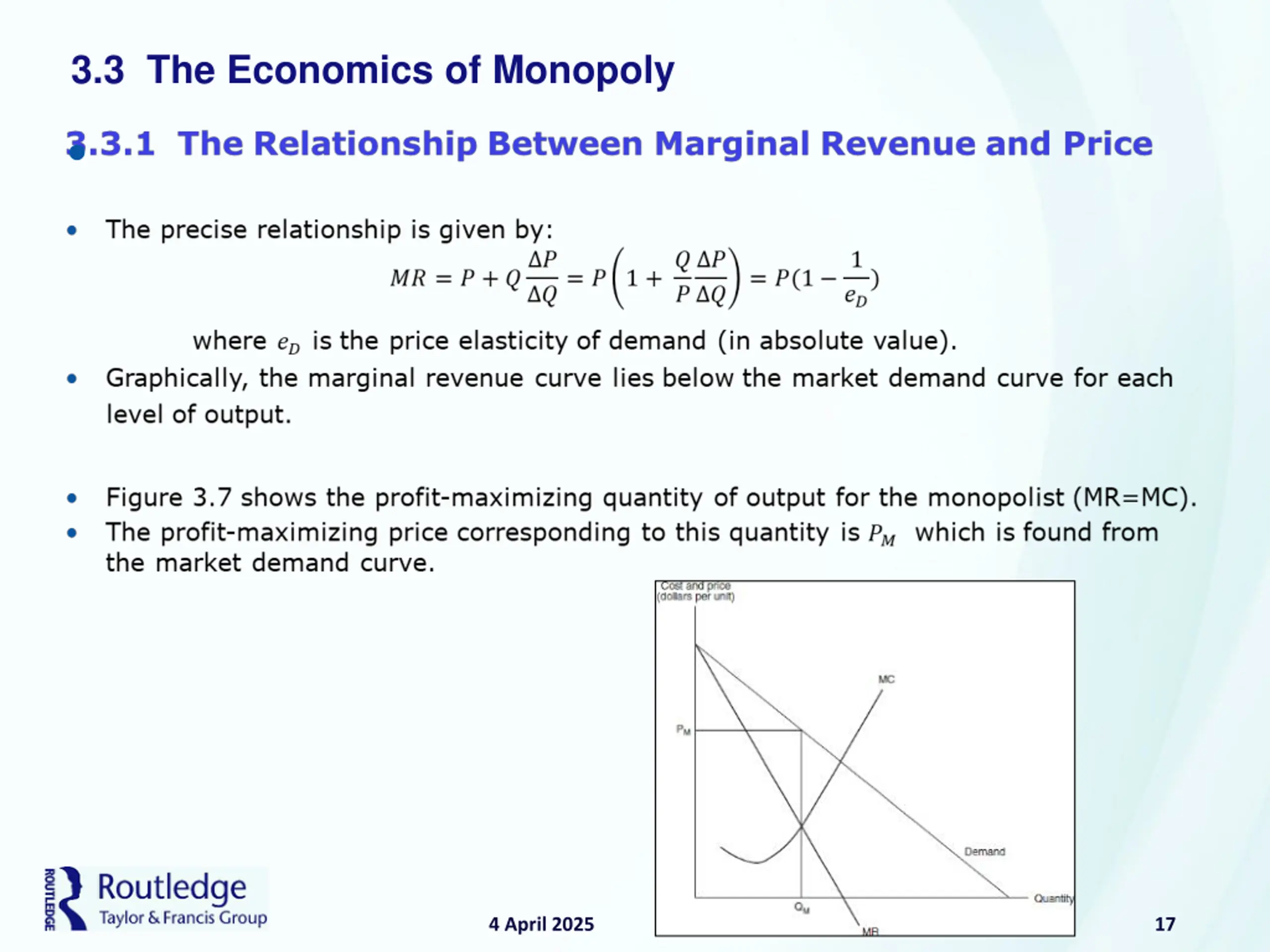 3.3 The Economics of Monopoly 3.3.1 The Relationship Between Marginal Revenue and Price Figure 3.6 shows the trade-off faced by a monopoly. At P1 the monopoly sells Q1 units of output. Total revenue is the area of the rectangle OP1AQ1 To sell (Q1 +1) the monopolist must lower price to P2 The monopoly gains area Q1CB(Q1+1) (= P2) in total revenue. The monopoly also loses area P1ACP2, the original quantity sold times the change in price. Marginal revenue is the sum of the two areas. Thus for a monopoly, MR < P. 4 April 2025 16