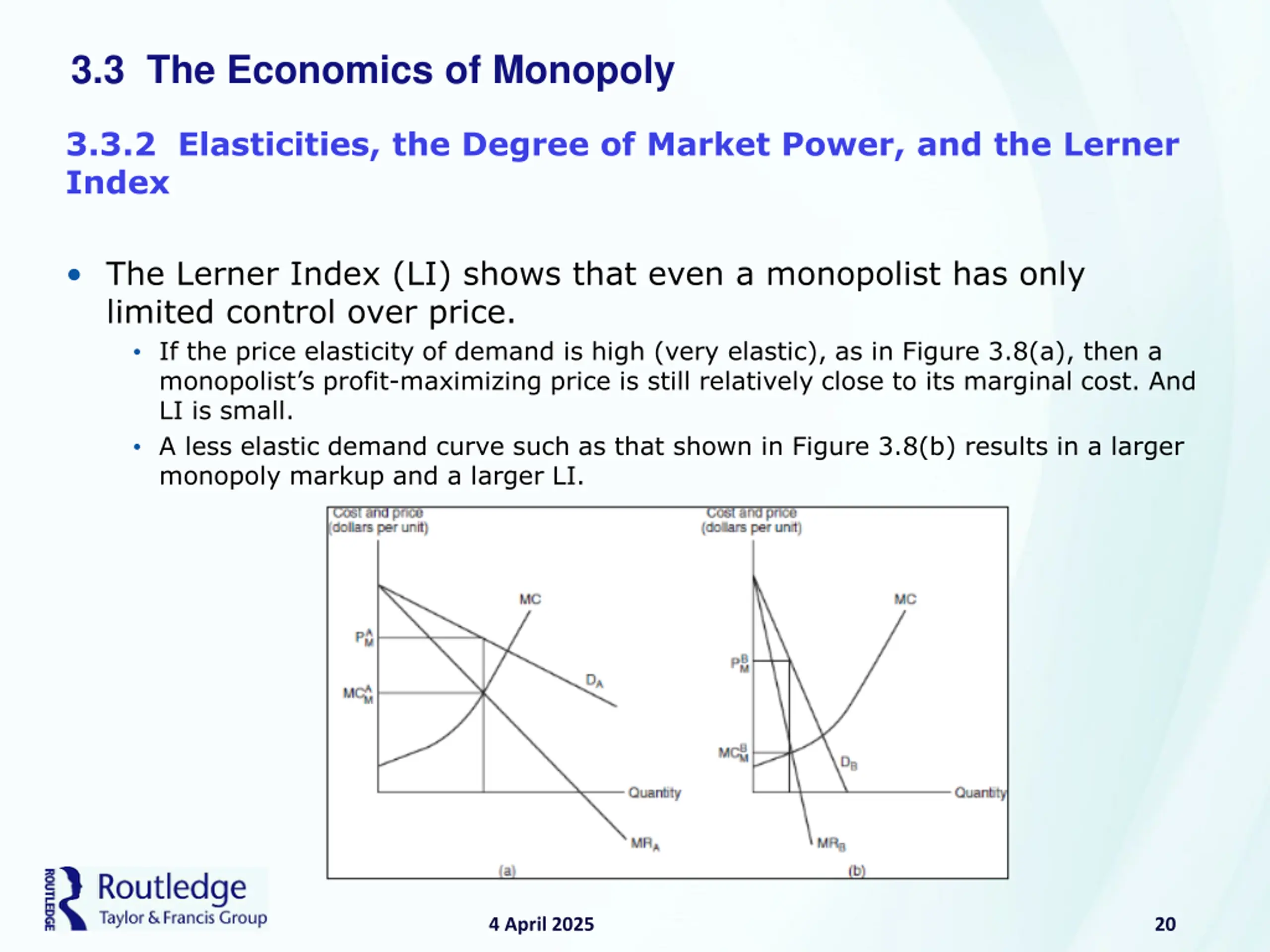 3.3 The Economics of Monopoly 3.3.2 Elasticities, the Degree of Market Power, and the Lerner Index The Lerner Index (LI) shows that even a monopolist has only limited control over price. If the price elasticity of demand is high (very elastic), as in Figure 3.8(a), then a monopolist s profit-maximizing price is still relatively close to its marginal cost. And LI is small. A less elastic demand curve such as that shown in Figure 3.8(b) results in a larger monopoly markup and a larger LI. 4 April 2025 20