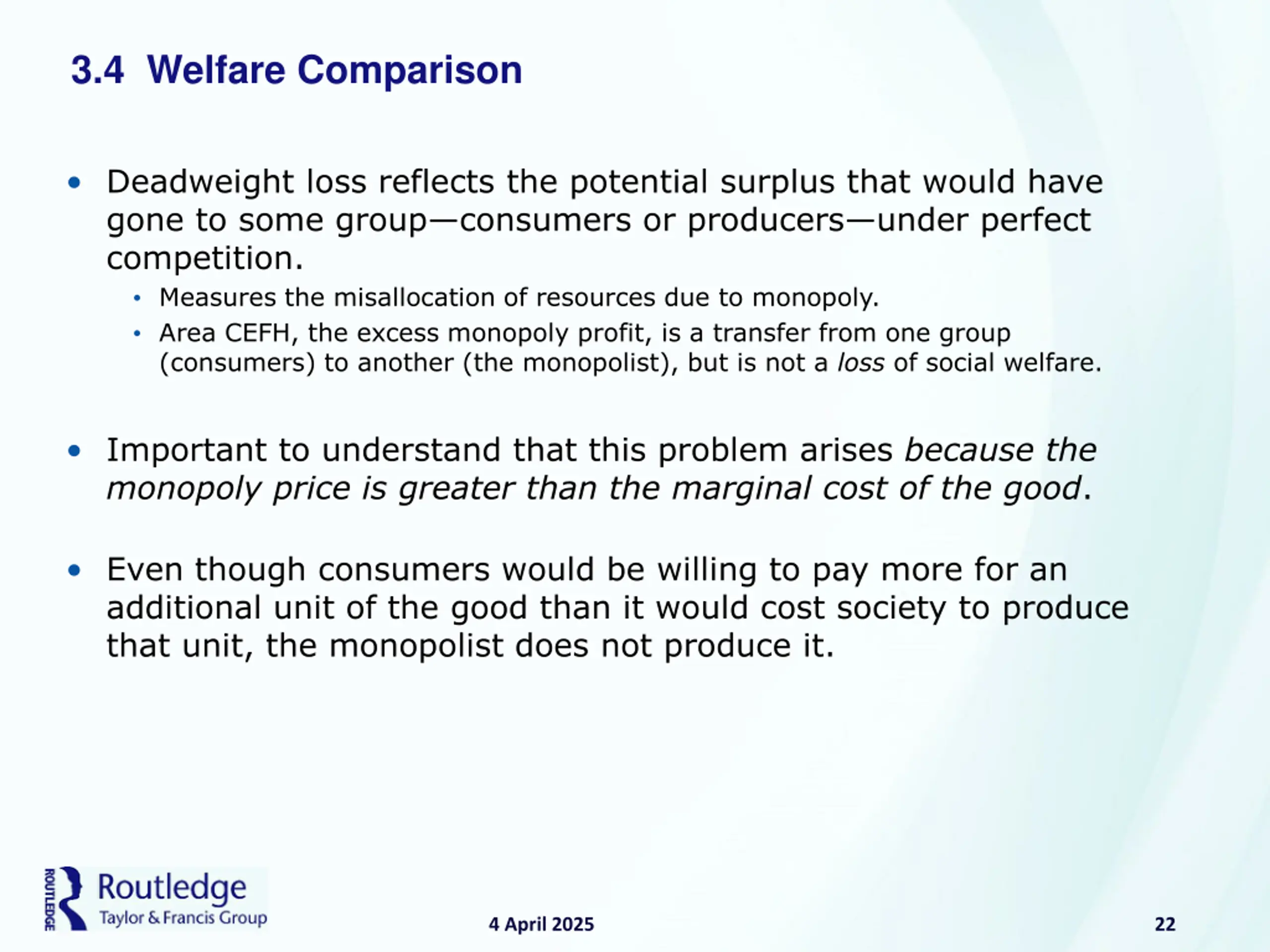 3.4 Welfare Comparison Deadweight loss reflects the potential surplus that would have gone to some group consumers or producers under perfect competition. Measures the misallocation of resources due to monopoly. Area CEFH, the excess monopoly profit, is a transfer from one group (consumers) to another (the monopolist), but is not a loss of social welfare. Important to understand that this problem arises because the monopoly price is greater than the marginal cost of the good. Even though consumers would be willing to pay more for an additional unit of the good than it would cost society to produce that unit, the monopolist does not produce it. 4 April 2025 22
