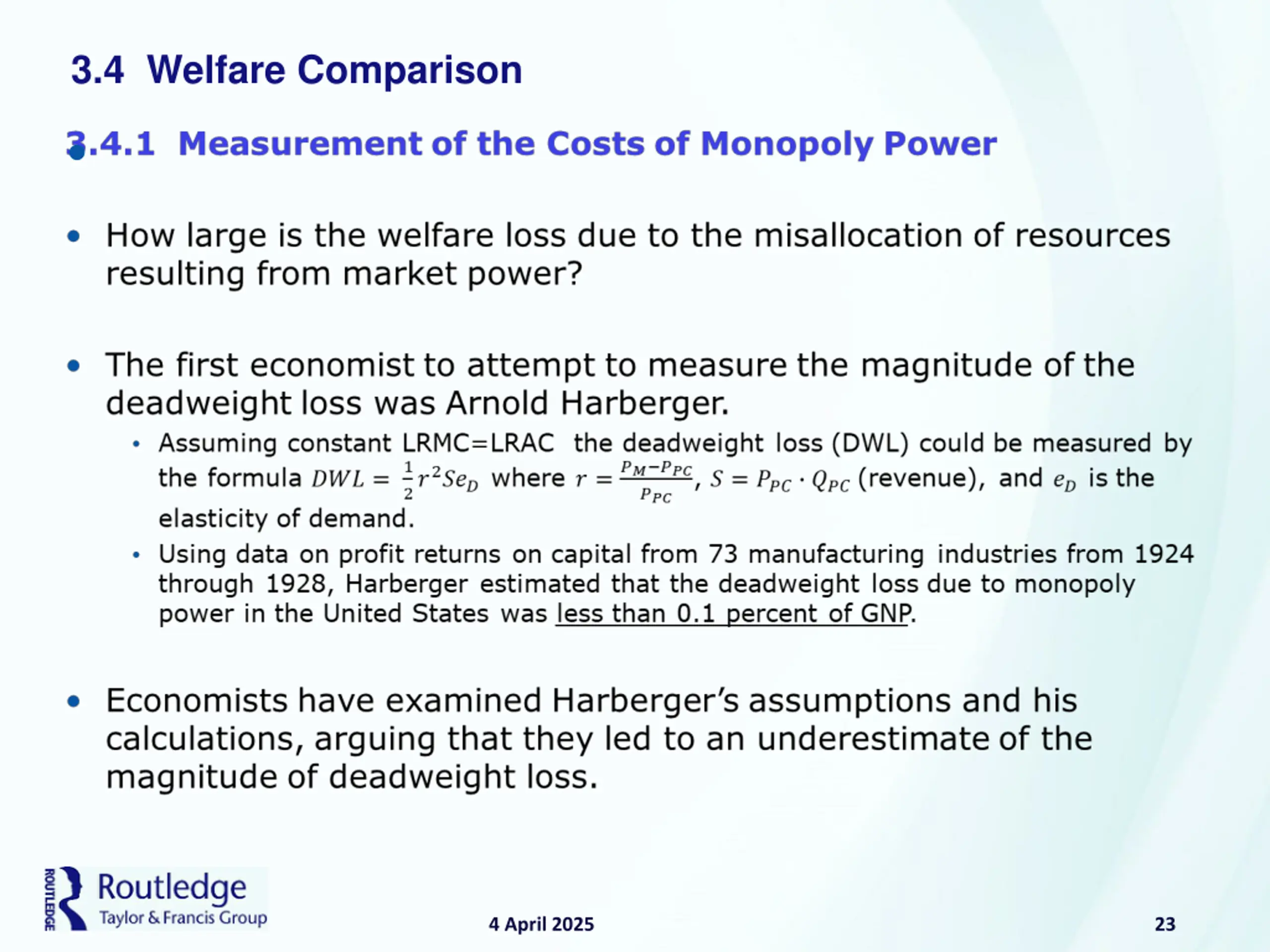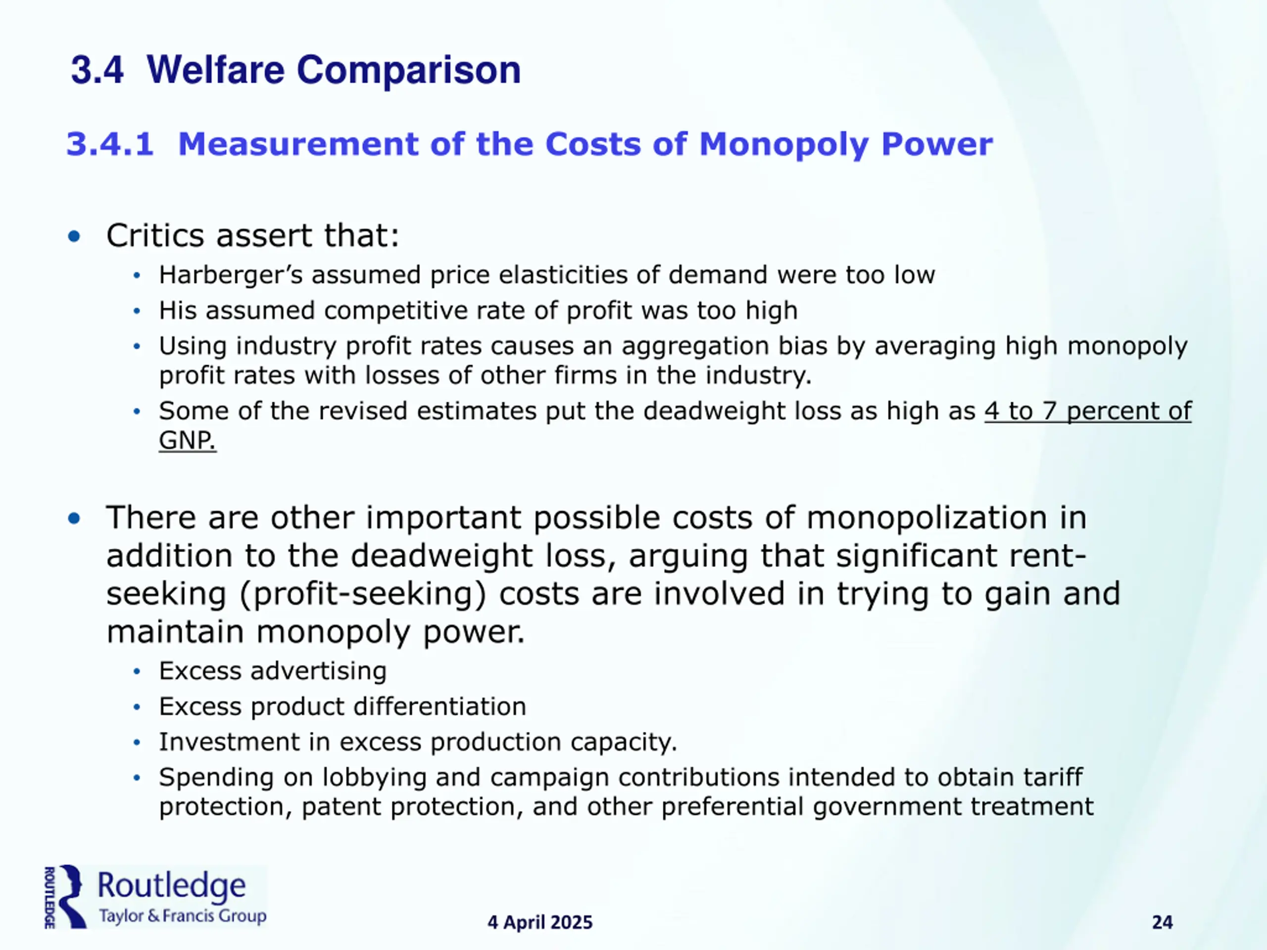 3.4 Welfare Comparison 3.4.1 Measurement of the Costs of Monopoly Power Critics assert that: Harberger s assumed price elasticities of demand were too low His assumed competitive rate of profit was too high Using industry profit rates causes an aggregation bias by averaging high monopoly profit rates with losses of other firms in the industry. Some of the revised estimates put the deadweight loss as high as 4 to 7 percent of GNP. There are other important possible costs of monopolization in addition to the deadweight loss, arguing that significant rent- seeking (profit-seeking) costs are involved in trying to gain and maintain monopoly power. Excess advertising Excess product differentiation Investment in excess production capacity. Spending on lobbying and campaign contributions intended to obtain tariff protection, patent protection, and other preferential government treatment 4 April 2025 24