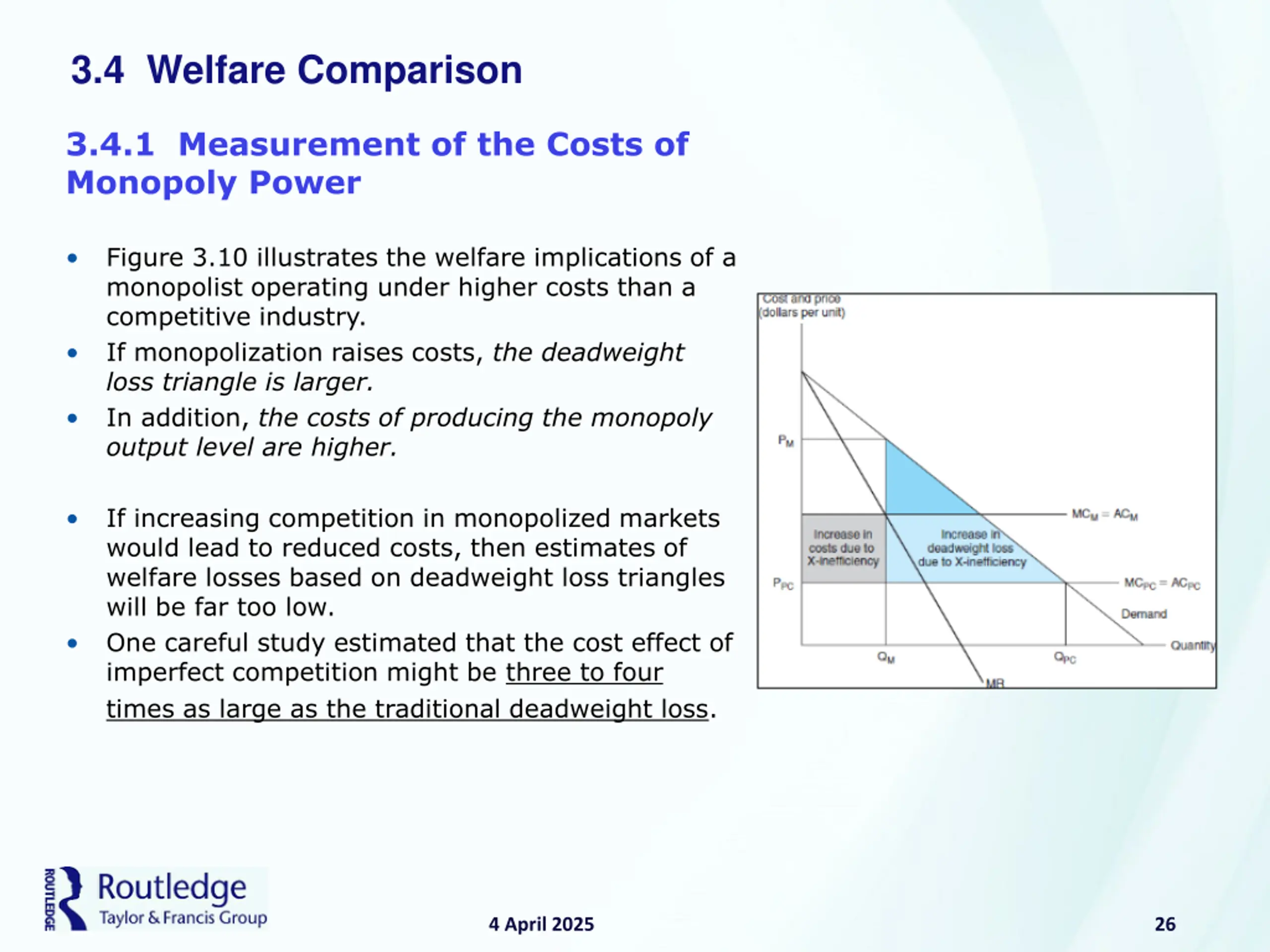 3.4 Welfare Comparison 3.4.1 Measurement of the Costs of Monopoly Power Figure 3.10 illustrates the welfare implications of a monopolist operating under higher costs than a competitive industry. If monopolization raises costs, the deadweight loss triangle is larger. In addition, the costs of producing the monopoly output level are higher. If increasing competition in monopolized markets would lead to reduced costs, then estimates of welfare losses based on deadweight loss triangles will be far too low. One careful study estimated that the cost effect of imperfect competition might be three to four times as large as the traditional deadweight loss. 4 April 2025 26