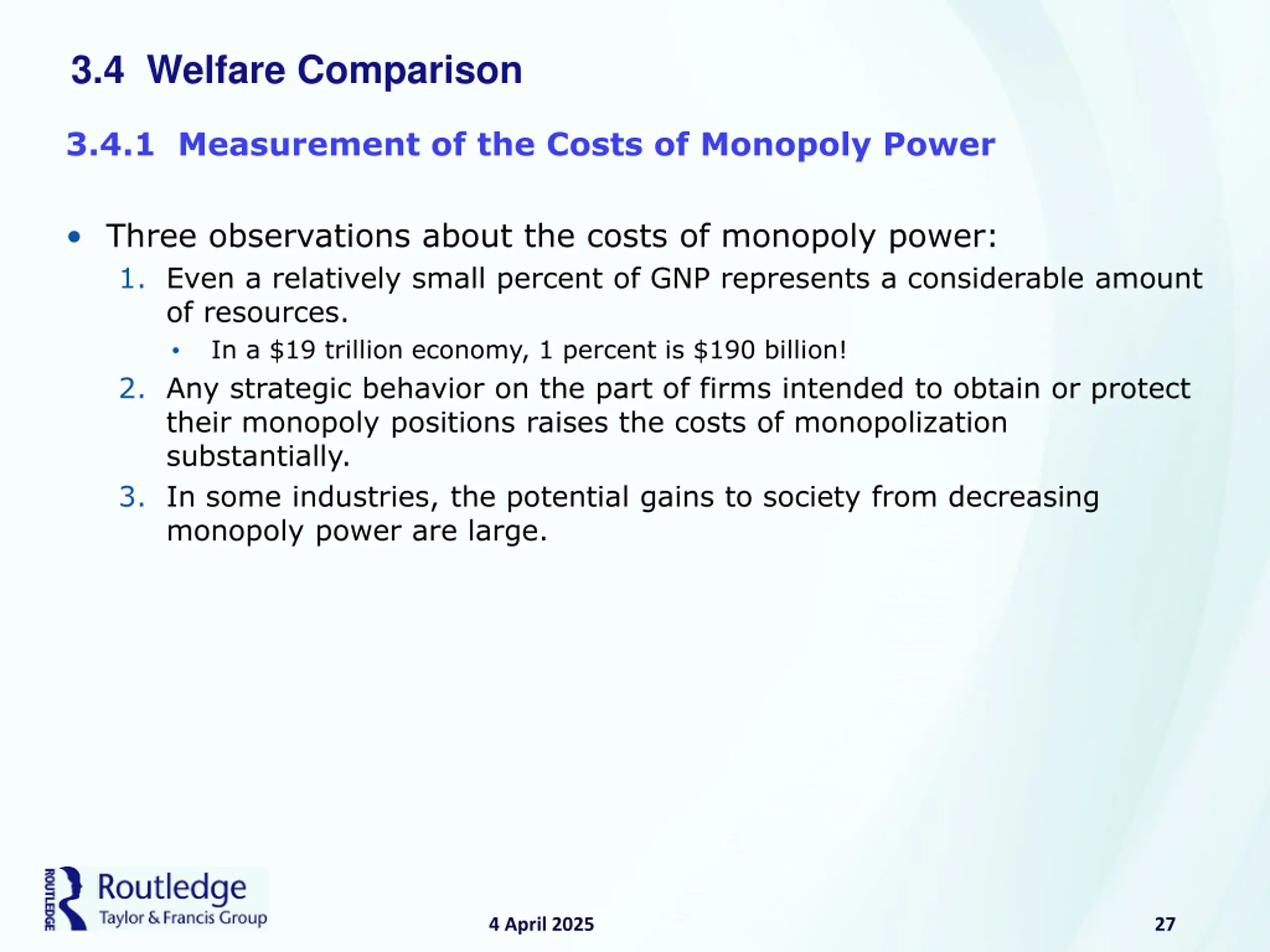 3.4 Welfare Comparison 3.4.1 Measurement of the Costs of Monopoly Power Three observations about the costs of monopoly power: 1. Even a relatively small percent of GNP represents a considerable amount of resources. In a $19 trillion economy, 1 percent is $190 billion! 2. Any strategic behavior on the part of firms intended to obtain or protect their monopoly positions raises the costs of monopolization substantially. 3. In some industries, the potential gains to society from decreasing monopoly power are large. 4 April 2025 27