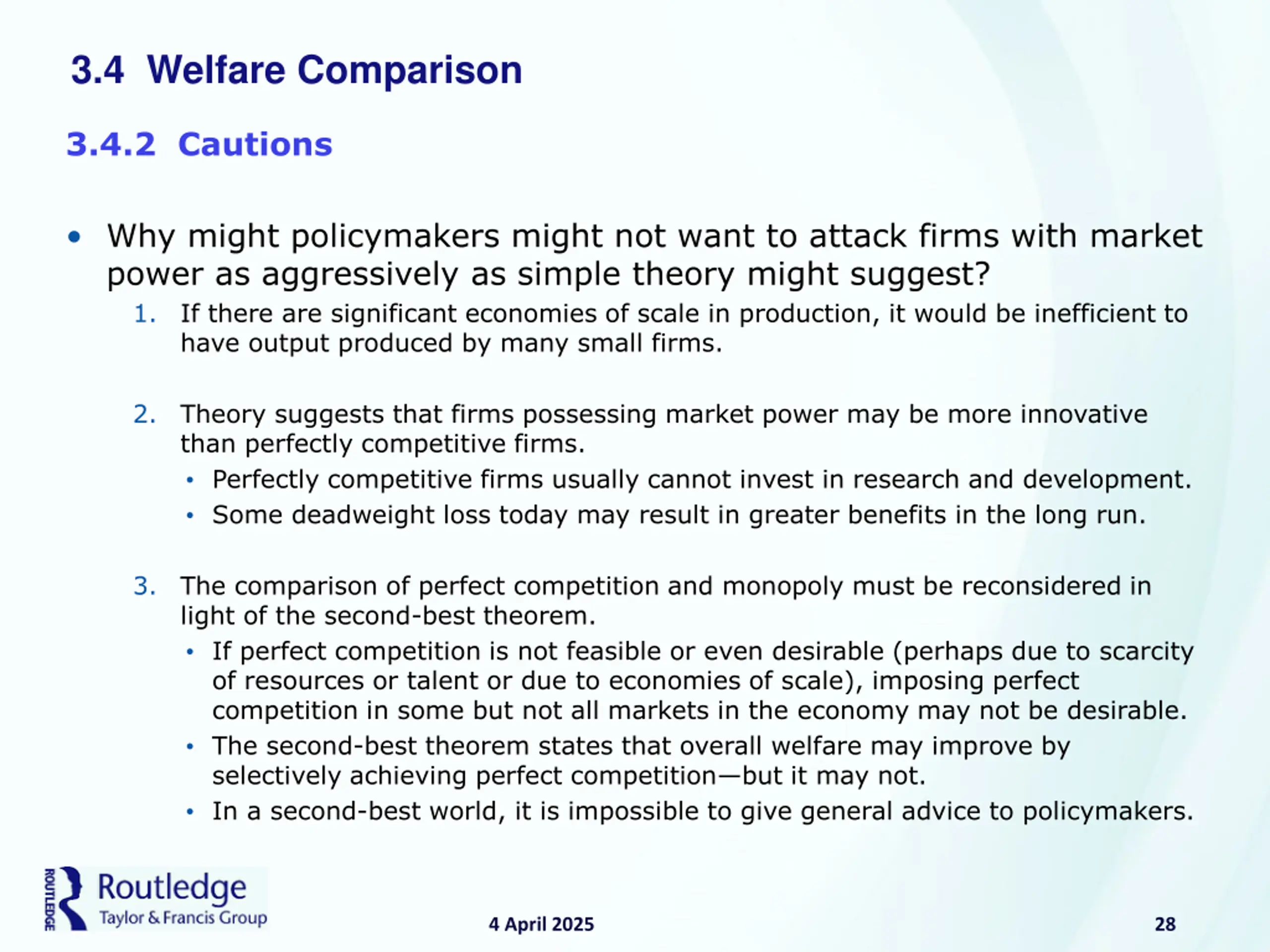 3.4 Welfare Comparison 3.4.2 Cautions Why might policymakers might not want to attack firms with market power as aggressively as simple theory might suggest? 1. If there are significant economies of scale in production, it would be inefficient to have output produced by many small firms. 2. Theory suggests that firms possessing market power may be more innovative than perfectly competitive firms. Perfectly competitive firms usually cannot invest in research and development. Some deadweight loss today may result in greater benefits in the long run. 3. The comparison of perfect competition and monopoly must be reconsidered in light of the second-best theorem. If perfect competition is not feasible or even desirable (perhaps due to scarcity of resources or talent or due to economies of scale), imposing perfect competition in some but not all markets in the economy may not be desirable. The second-best theorem states that overall welfare may improve by selectively achieving perfect competition but it may not. In a second-best world, it is impossible to give general advice to policymakers. 4 April 2025 28