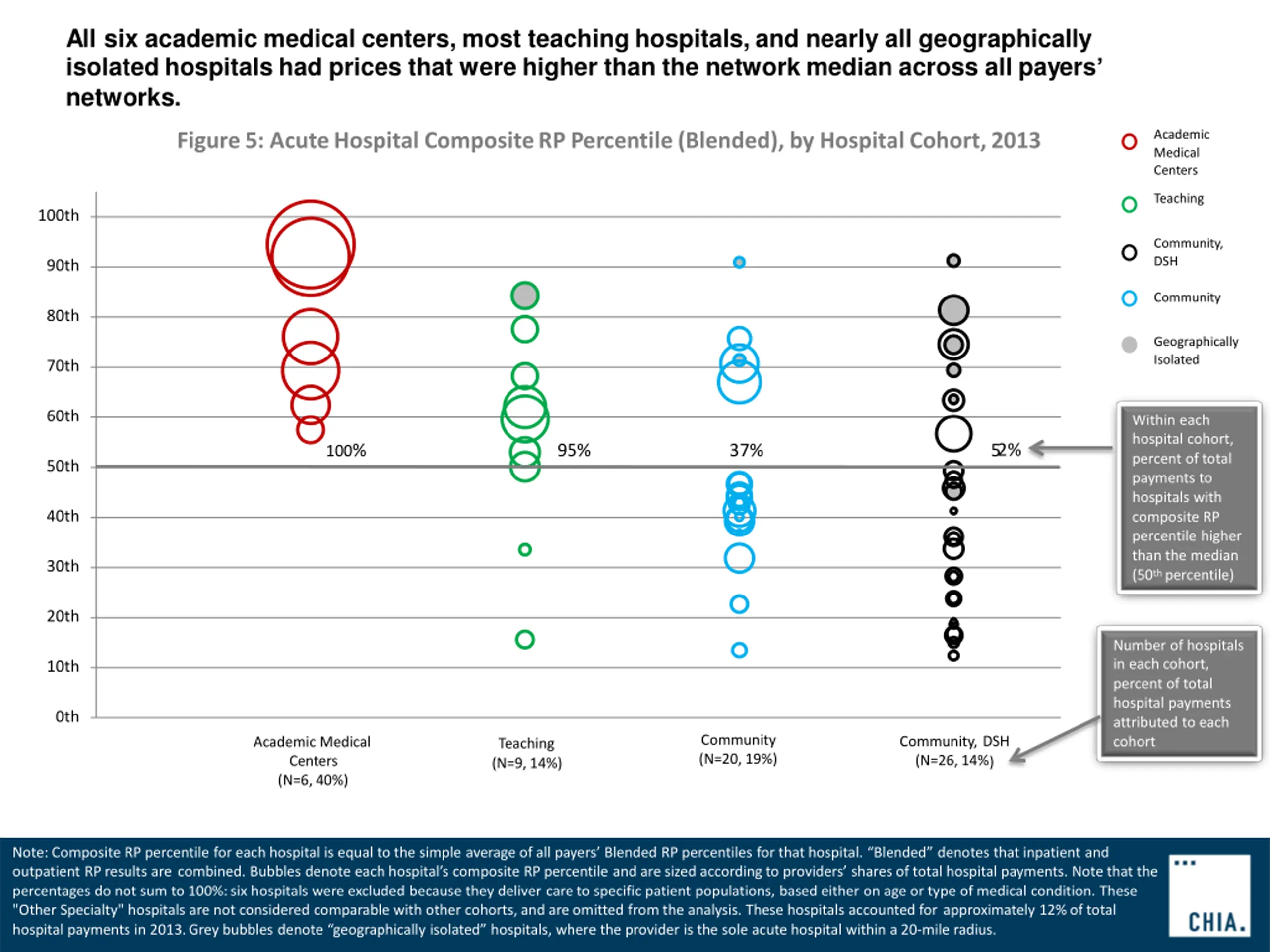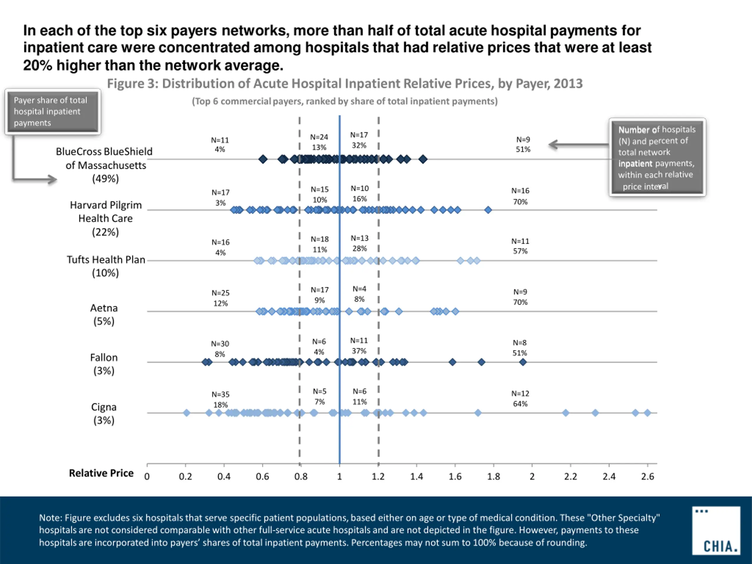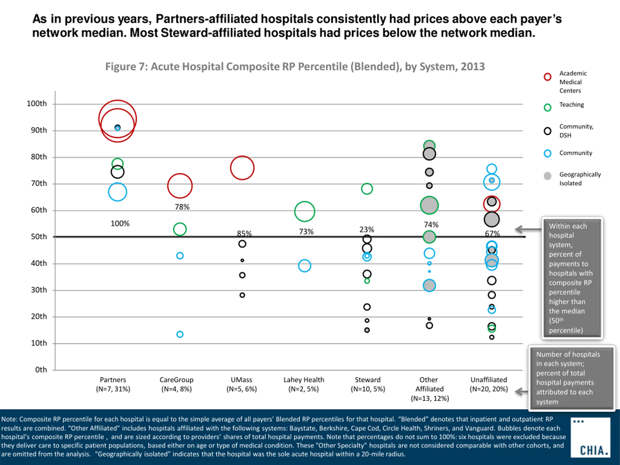 As in previous years, Partners-affiliated hospitals consistently had prices above each payers network median. Most Steward-affiliated hospitals had prices below the network median. Figure7: AcuteHospitalCompositeRP Percentile(Blended), by System, 2013 Academic Medical Centers 100th Teaching Community, DSH 90th Community 80th Geographically Isolated 70th 78% 60th 100% 85% 73% 23% 67% 74% Within each hospital system, percent of payments to hospitals with composite RP percentile higher than the median (50th percentile) 50th 40th 30th 20th 10th Number of hospitals in each system; percent of total hospital payments attributed to each system 0th Partners (N=7, 31%) CareGroup (N=4, 8%) UMass (N=5, 6%) Lahey Health (N=2, 5%) Steward (N=10, 5%) Other Affiliated (N=13, 12%) Unaffiliated (N=20, 20%) Note: Composite RP percentile for each hospital is equal to the simple average of all payers Blended RP percentiles for that hospital. Blended denotes that inpatient and outpatient RP results are combined. Other Affiliated includes hospitals affiliated with the following systems: Baystate, Berkshire, Cape Cod, Circle Health, Shriners, and Vanguard. Bubbles denote each hospital s composite RP percentile , and are sized according to providers shares of total hospital payments. Note that percentages do not sum to 100%:six hospitals were excluded because they deliver care to specific patient populations, based either on age or type of medical condition. These "Other Specialty" hospitals are not considered comparable with other cohorts, and are omitted from the analysis. Geographically isolated indicates that the hospital was the sole acute hospital within a 20-mileradius.