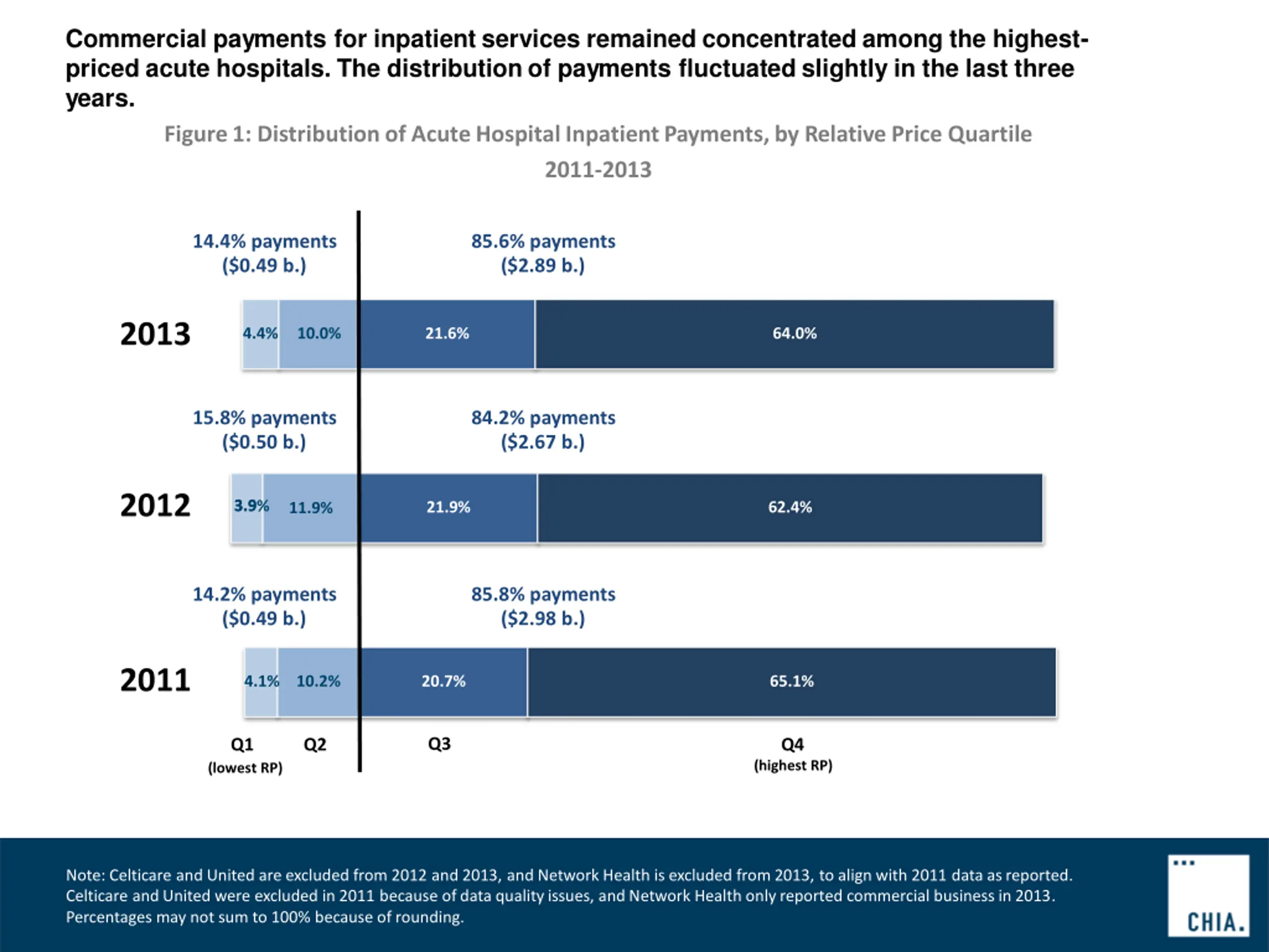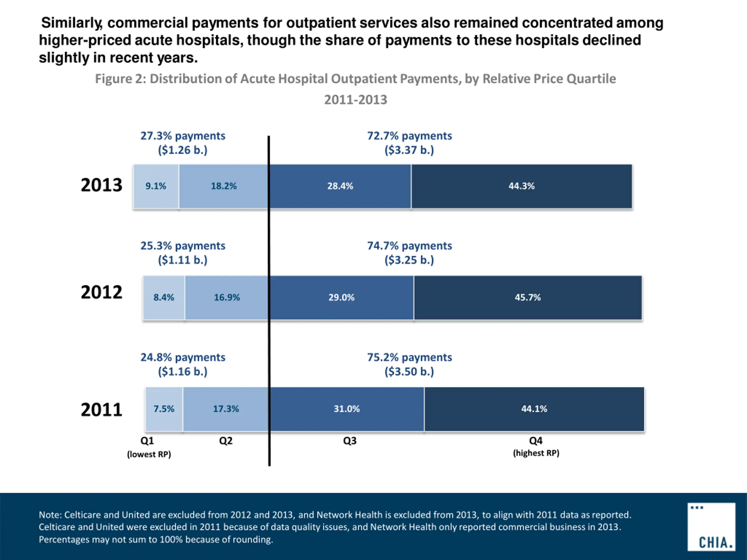 Similarly , commercial payments for outpatient services also remained concentrated among higher-priced acute hospitals, though the share of payments to these hospitals declined slightly in recent years. Figure2: Distributionof AcuteHospitalOutpatientPayments,by RelativePrice Quartile 2011-2013 27.3% payments ($1.26 b.) 72.7% payments ($3.37 b.) 2013 9.1% 18.2% 28.4% 44.3% 25.3% payments ($1.11 b.) 74.7% payments ($3.25 b.) 2012 8.4% 16.9% 29.0% 45.7% 24.8% payments ($1.16 b.) 75.2% payments ($3.50 b.) 2011 7.5% 17.3% 31.0% 44.1% Q1 Q2 Q3 Q4 (highest RP) (lowest RP) Note: Celticare and United are excluded from 2012 and 2013, and Network Health is excluded from 2013, to align with 2011 data asreported. Celticare andUnited were excluded in 2011 because of data qualityissues, andNetwork Health onlyreported commercial businessin 2013. Percentages may not sum to 100% because of rounding.