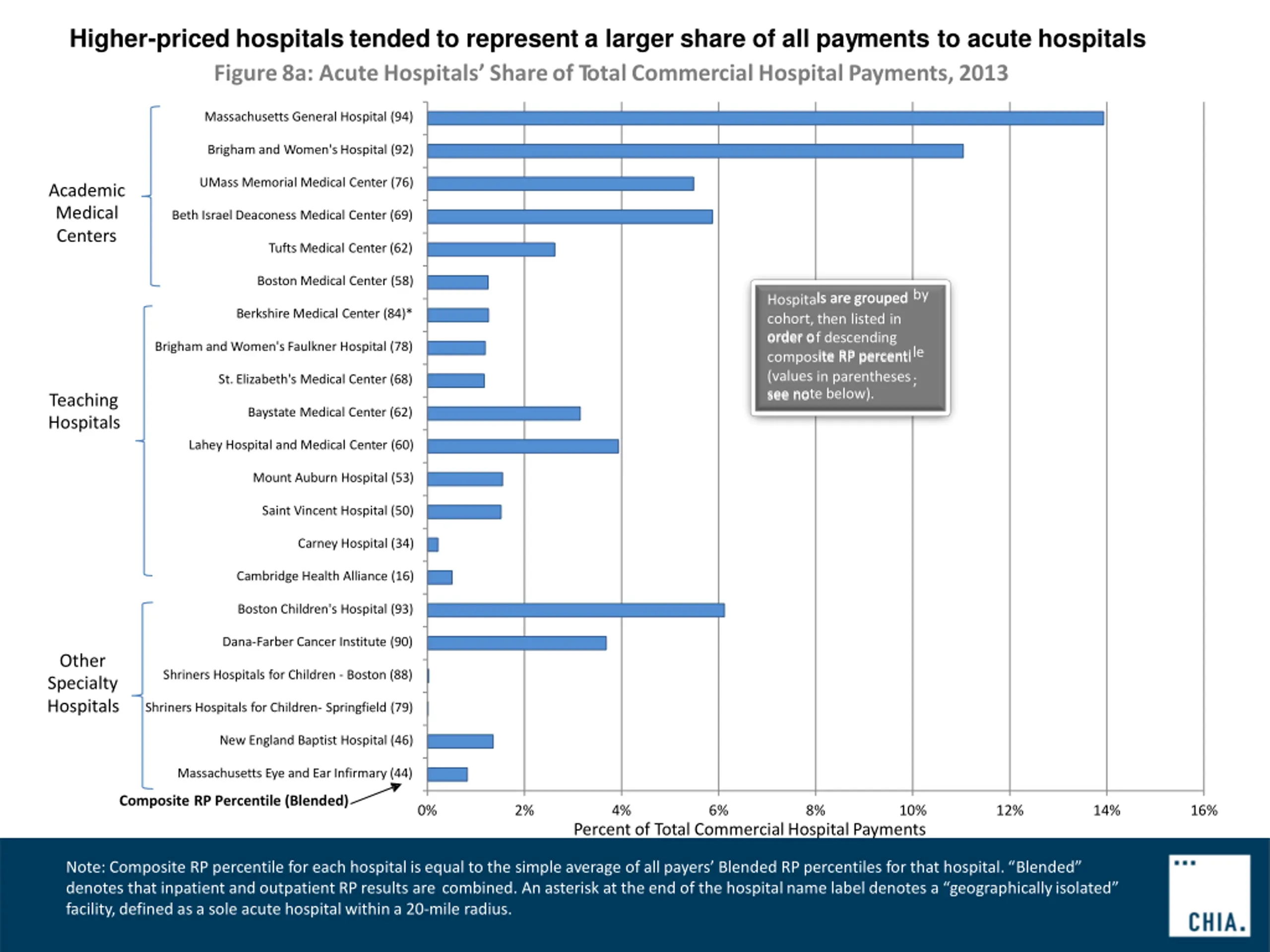 Higher-priced hospitals tended to represent a larger share of all payments to acute hospitals Figure8b: AcuteHospitals Shareof TotalCommercialHospitalPayments,2013 Nantucket Cottage Hospital (91)* Cooley Dickinson Hospital (76) North Adams Regional Hospital (71)* South Shore Hospital (71) Newton-Wellesley Hospital (67) Jordan Hospital (47) Hospitals are grouped by cohort, then listed in order of descending composite RP percentile (values in parentheses; see note below). Hallmark Health (47) Milford Regional Medical Center (45) MetroWest Medical Center (44) Community Hospitals Beth Israel Deaconess Hospital - Needham (43) Nashoba Valley Medical Center (43) Norwood Hospital (43) Winchester Hospital (41) Baystate Mary Lane Hospital (40) Emerson Hospital (40) Northeast Hospital (39) Saints Medical Center (37) Lowell General Hospital (32) Anna Jaques Hospital (23) Beth Israel Deaconess Hospital - Milton (14) Composite RP Percentile (Blended) 0% 2% 4% 6% 8% 10% 12% 14% 16% Percentof Total CommercialHospitalPayments Note: Composite RP percentile for each hospitalisequal to the simple average of all payers Blended RP percentiles for that hospital. Blended denotes that inpatient and outpatientRP results are combined. An asterisk at the end of the hospitalname label denotes a geographicallyisolated facility,defined as a sole acute hospitalwithin a 20-mile radius.