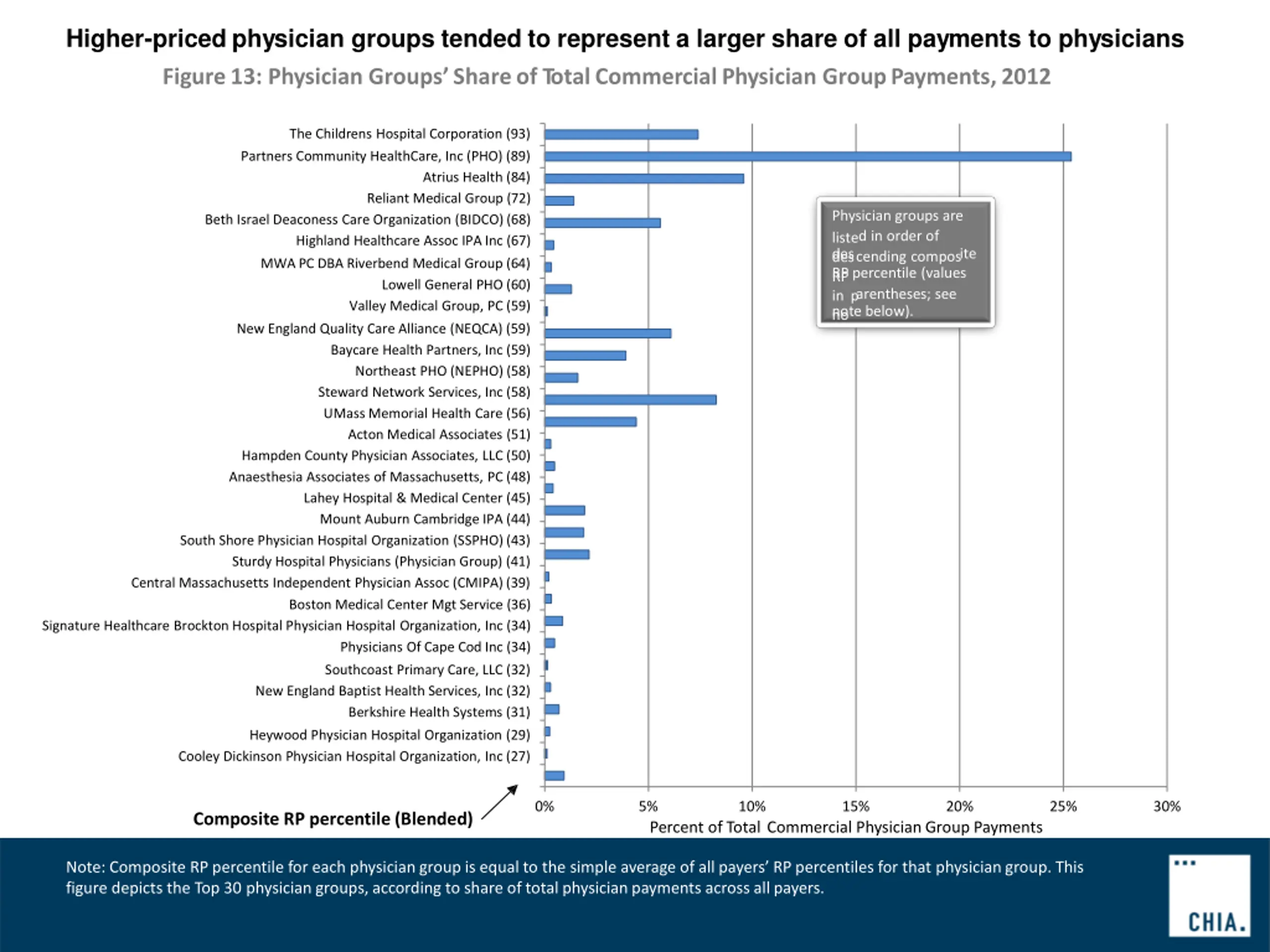 Higher-priced physician groups tended to represent a larger share of all payments to physicians Figure13: Physician Groups Shareof TotalCommercialPhysician GroupPayments,2012 The Childrens Hospital Corporation (93) Partners Community HealthCare, Inc (PHO) (89) Atrius Health (84) Reliant Medical Group (72) Physician groups are liste des RP in p no Beth Israel Deaconess Care Organization (BIDCO)(68) Highland Healthcare Assoc IPA Inc (67) d in order of cending compos ite des RP percentile (values arentheses; see MWA PC DBA Riverbend Medical Group (64) Lowell General PHO (60) Valley Medical Group, PC(59) note below). New England Quality Care Alliance (NEQCA) (59) Baycare Health Partners, Inc (59) Northeast PHO (NEPHO) (58) Steward Network Services, Inc (58) UMass Memorial Health Care (56) Acton Medical Associates (51) Hampden County Physician Associates, LLC (50) Anaesthesia Associates of Massachusetts, PC (48) Lahey Hospital & Medical Center (45) Mount Auburn Cambridge IPA (44) South Shore Physician Hospital Organization (SSPHO)(43) Sturdy Hospital Physicians (Physician Group) (41) Central Massachusetts Independent Physician Assoc (CMIPA)(39) Boston Medical Center Mgt Service (36) Signature Healthcare Brockton Hospital Physician Hospital Organization, Inc (34) Physicians Of Cape Cod Inc (34) Southcoast Primary Care, LLC (32) New England Baptist Health Services, Inc (32) Berkshire Health Systems (31) Heywood Physician Hospital Organization (29) Cooley Dickinson Physician Hospital Organization, Inc (27) 0% 5% 10% 15% 20% 25% 30% Composite RP percentile(Blended) Percent of Total Commercial PhysicianGroup Payments Note: Composite RP percentile for each physiciangroup is equal to the simple average of all payers RP percentiles for that physiciangroup. This figure depicts the Top 30 physiciangroups,according to share of total physicianpayments across allpayers.