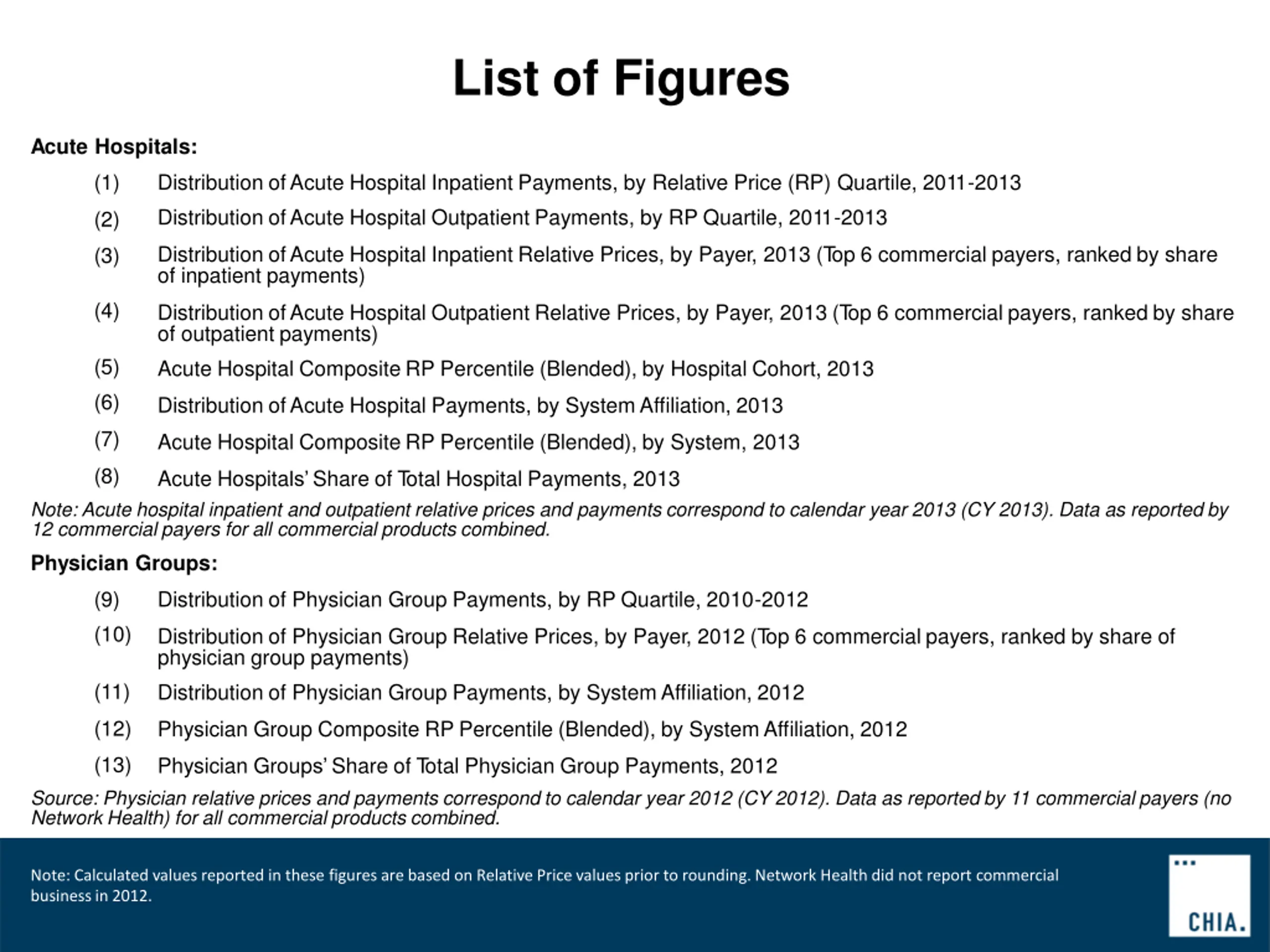 List of Figures Acute Hospitals: (1) Distribution ofAcute Hospital Inpatient Payments, by Relative Price (RP) Quartile, 2011-2013 Distribution ofAcute Hospital Outpatient Payments, by RP Quartile, 2011-2013 (2) Distribution ofAcute Hospital Inpatient Relative Prices, by Payer, 2013 (T op 6 commercial payers, ranked by share of inpatient payments) (3) (4) Distribution ofAcute Hospital Outpatient Relative Prices, by Payer, 2013 (T op 6 commercial payers, ranked by share of outpatient payments) Acute Hospital Composite RP Percentile (Blended), by Hospital Cohort, 2013 (5) (6) Distribution ofAcute Hospital Payments, by SystemAffiliation, 2013 (7) Acute Hospital Composite RP Percentile (Blended), by System, 2013 (8) Acute Hospitals Share of T otal Hospital Payments, 2013 Note: Acute hospital inpatient and outpatient relative prices and payments correspond to calendar year 2013 (CY 2013). Data as reported by 12 commercial payers for all commercial products combined. Physician Groups: (9) (10) Distribution of Physician Group Payments, by RP Quartile, 2010-2012 Distribution of Physician Group Relative Prices, by Payer, 2012 (T op 6 commercial payers, ranked by share of physician group payments) Distribution of Physician Group Payments, by SystemAffiliation, 2012 (11) (12) Physician Group Composite RP Percentile (Blended), by SystemAffiliation, 2012 (13) Physician Groups Share of T otal Physician Group Payments, 2012 Source: Physician relative prices and payments correspond to calendar year 2012 (CY 2012). Data as reported by 11 commercial payers (no Network Health) for all commercial products combined. Note: Calculated values reported in these figures are based on Relative Price valuesprior to rounding.Network Health did not report commercial businessin 2012.