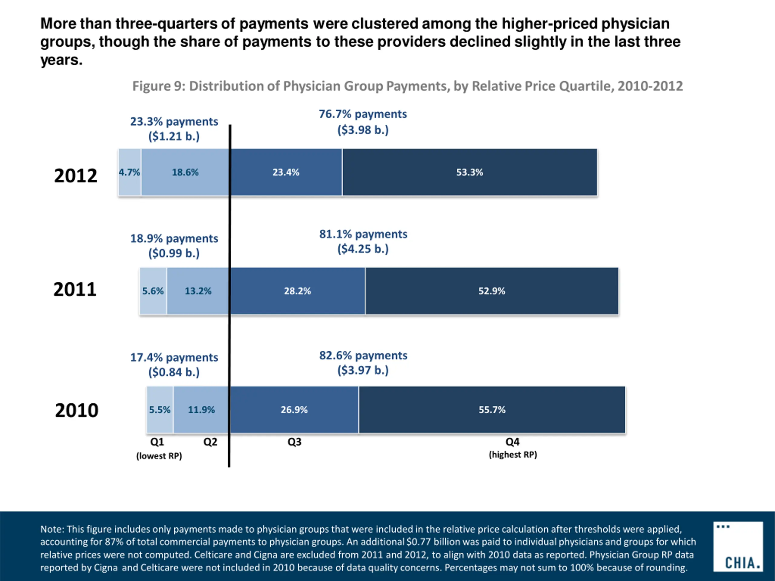 More than three-quarters of payments were clustered among the higher-priced physician groups, though the share of payments to these providers declined slightly in the last three years. Figure9: Distributionof Physician GroupPayments,by RelativePrice Quartile,2010-2012 76.7% payments ($3.98 b.) 23.3% payments ($1.21 b.) 2012 4.7% 18.6% 23.4% 53.3% 81.1% payments ($4.25 b.) 18.9% payments ($0.99 b.) 2011 5.6% 13.2% 28.2% 52.9% 82.6% payments ($3.97 b.) 17.4% payments ($0.84 b.) 2010 5.5% 11.9% 26.9% 55.7% Q1 Q2 Q3 Q4 (highest RP) (lowest RP) Note: This figure includesonly paymentsmade to physiciangroupsthat were includedin the relative price calculation after thresholdswere applied, accounting for 87% of total commercial payments to physiciangroups. An additional$0.77 billionwas paid to individualphysiciansandgroups for which relative prices were not computed. Celticare and Cigna are excluded from 2011 and 2012, to align with 2010 data as reported. PhysicianGroup RP data reported by Cigna and Celticare were not included in 2010 because of data qualityconcerns. Percentages may not sum to 100% because ofrounding.