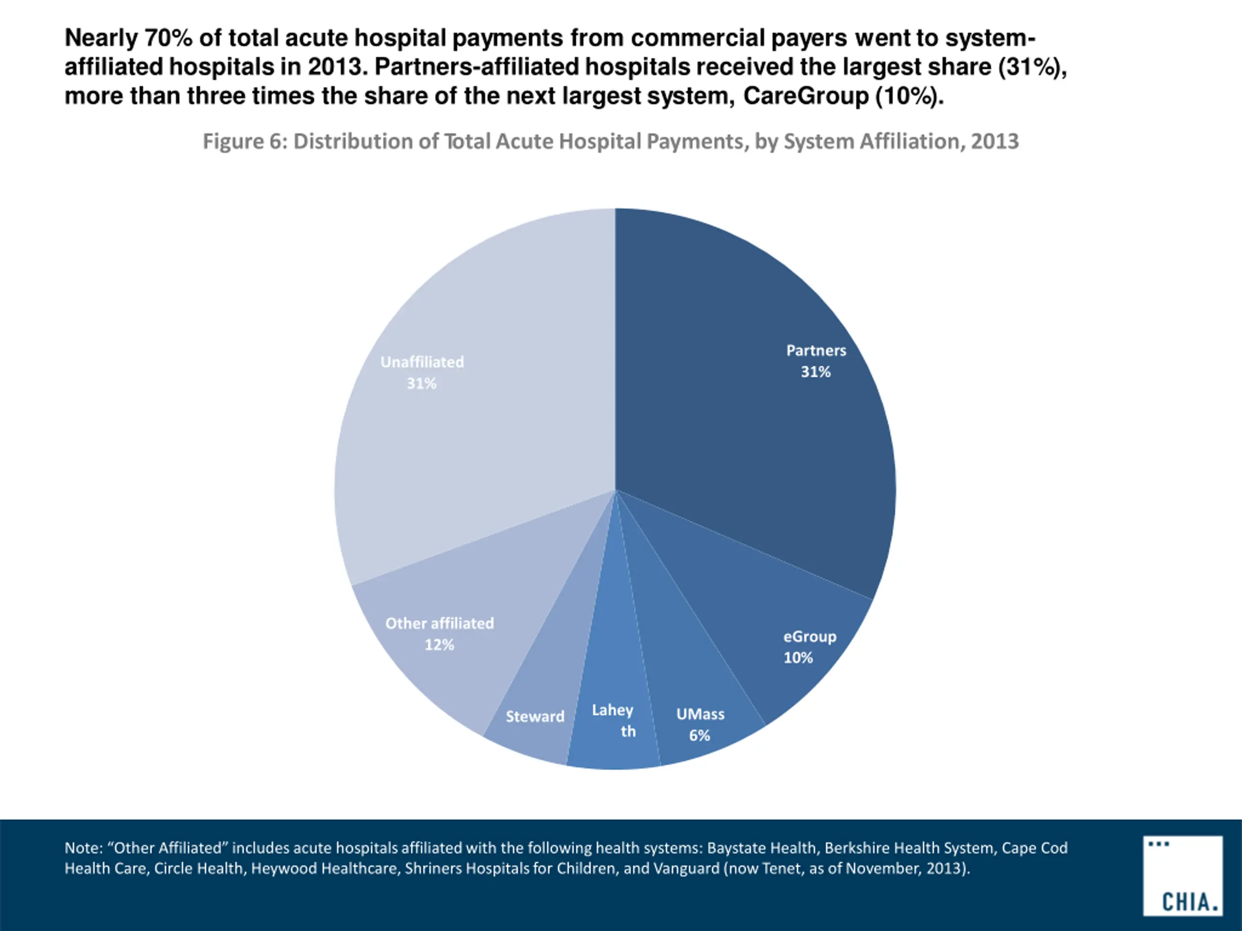 Nearly 70% of total acute hospital payments from commercial payers went to system- affiliated hospitals in 2013. Partners-affiliated hospitals received the largest share (31%), more than three times the share of the next largest system, CareGroup (10%). Figure6: Distributionof TotalAcuteHospitalPayments,by SystemAffiliation,2013 Partners 31% Unaffiliated 31% Other affiliated 12% eGroup 10% Lahey UMass 6% Steward th Note: Other Affiliated includesacute hospitalsaffiliatedwith the followinghealth systems: Baystate Health, Berkshire Health System, Cape Cod Health Care, Circle Health, Heywood Healthcare, Shriners Hospitalsfor Children, and Vanguard(nowTenet, as of November, 2013).