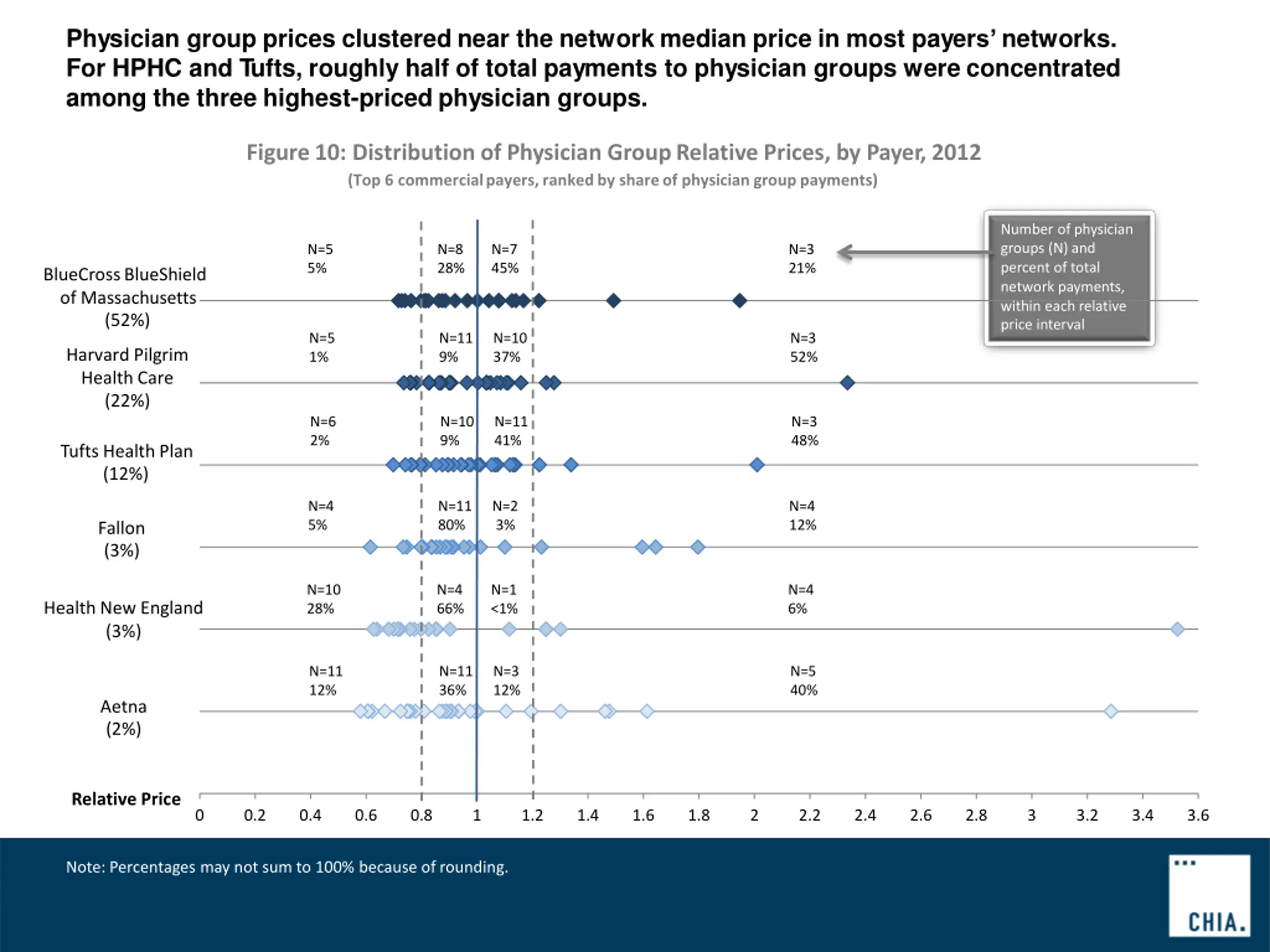 Physician group prices clustered near the network median price in most payersnetworks. For HPHC and Tufts, roughly half of total payments to physician groups were concentrated among the three highest-priced physician groups. Figure10: Distribution of Physician GroupRelative Prices, by Payer, 2012 (Top 6 commercialpayers,rankedby shareof physician grouppayments) Number of physician groups (N) and percent of total network payments, within each relative price interval N=5 5% N=8 28% N=7 45% N=3 21% BlueCrossBlueShield of Massachusetts (52%) N=5 1% N=11 9% N=10 37% N=3 52% Harvard Pilgrim Health Care (22%) N=6 2% N=10 9% N=11 41% N=3 48% Tufts Health Plan (12%) N=4 5% N=11 80% N=2 3% N=4 12% Fallon (3%) N=10 28% N=4 66% N=1 <1% N=4 6% Health New England (3%) N=11 12% N=11 36% N=3 12% N=5 40% Aetna (2%) Relative Price 0 0.2 0.4 0.6 0.8 1 1.2 1.4 1.6 1.8 2 2.2 2.4 2.6 2.8 3 3.2 3.4 3.6 Note: Percentages may not sum to 100% because of rounding.