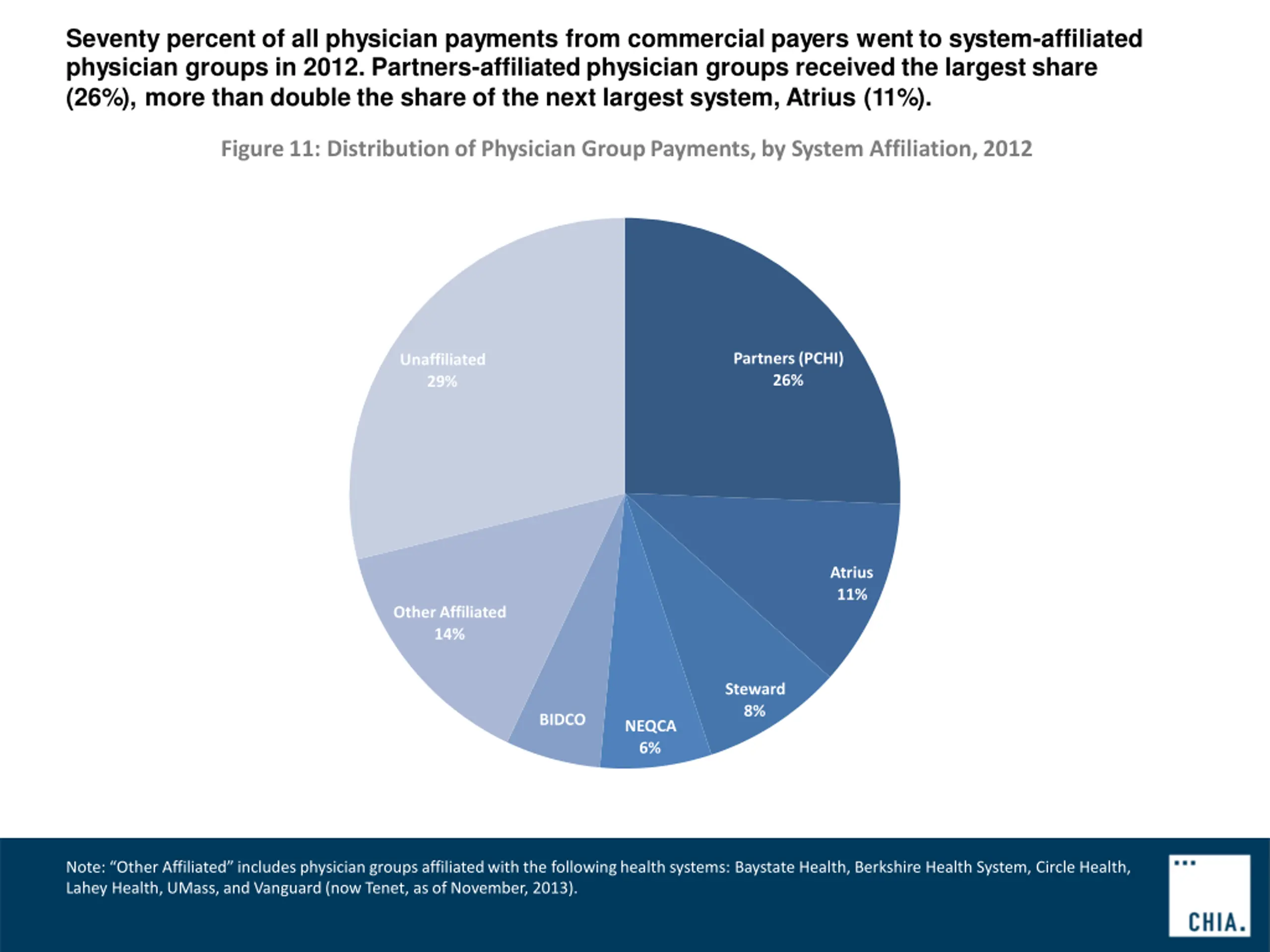 Seventy percent of all physician payments from commercial payers went to system-affiliated physician groups in 2012. Partners-affiliated physician groups received the largest share (26%), more than double the share of the next largest system, Atrius (11%). Figure11: Distributionof Physician GroupPayments,by System Affiliation,2012 Partners(PCHI) 26% Unaffiliated 29% Atrius 11% OtherAffiliated 14% Steward 8% BIDCO NEQCA 6% Note: Other Affiliated includesphysiciangroupsaffiliatedwith the followinghealth systems: Baystate Health, Berkshire Health System, Circle Health, Lahey Health, UMass,and Vanguard(now Tenet, asof November, 2013).