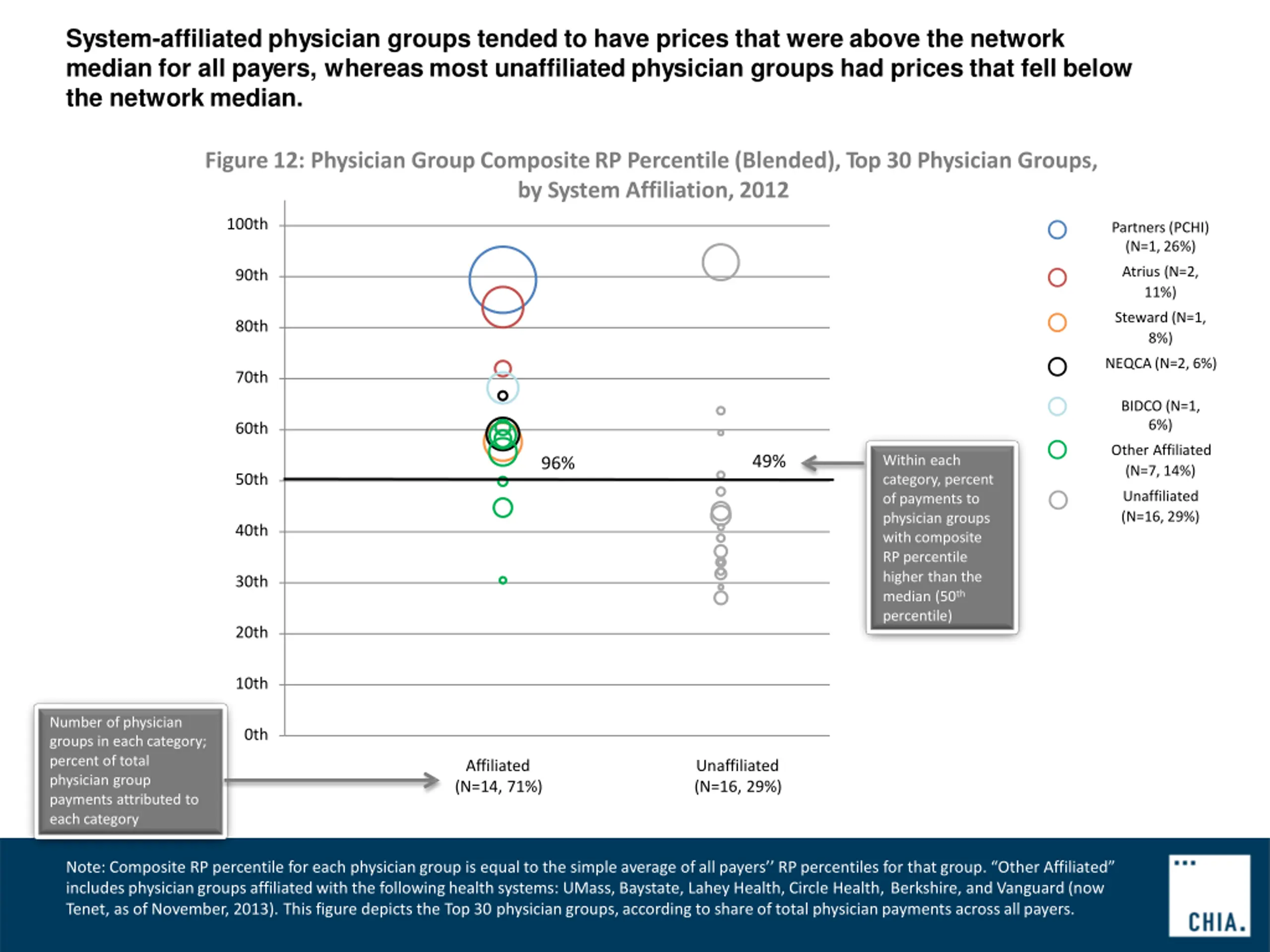 System-affiliated physician groups tended to have prices that were above the network median for all payers, whereas most unaffiliated physician groups had prices that fell below the network median. Figure12: Physician GroupCompositeRP Percentile(Blended),Top 30 Physician Groups, by System Affiliation,2012 100th Partners (PCHI) (N=1, 26%) Atrius (N=2, 11%) 90th Steward (N=1, 8%) 80th NEQCA(N=2, 6%) 70th BIDCO (N=1, 6%) 60th Other Affiliated (N=7, 14%) 96% 49% Within each category, percent of payments to physician groups with composite RP percentile higher than the median (50th percentile) 50th Unaffiliated (N=16, 29%) 40th 30th 20th 10th Number of physician groups in each category; percent of total physician group payments attributed to each category 0th Affiliated (N=14, 71%) Unaffiliated (N=16, 29%) Note: Composite RP percentile for each physiciangroup is equal to the simple average of all payers RP percentiles for that group. Other Affiliated includesphysiciangroupsaffiliatedwith the followinghealth systems: UMass, Baystate, Lahey Health, Circle Health, Berkshire, and Vanguard(now Tenet, as of November, 2013). This figure depicts the Top 30 physiciangroups,according to share of total physicianpayments across allpayers.