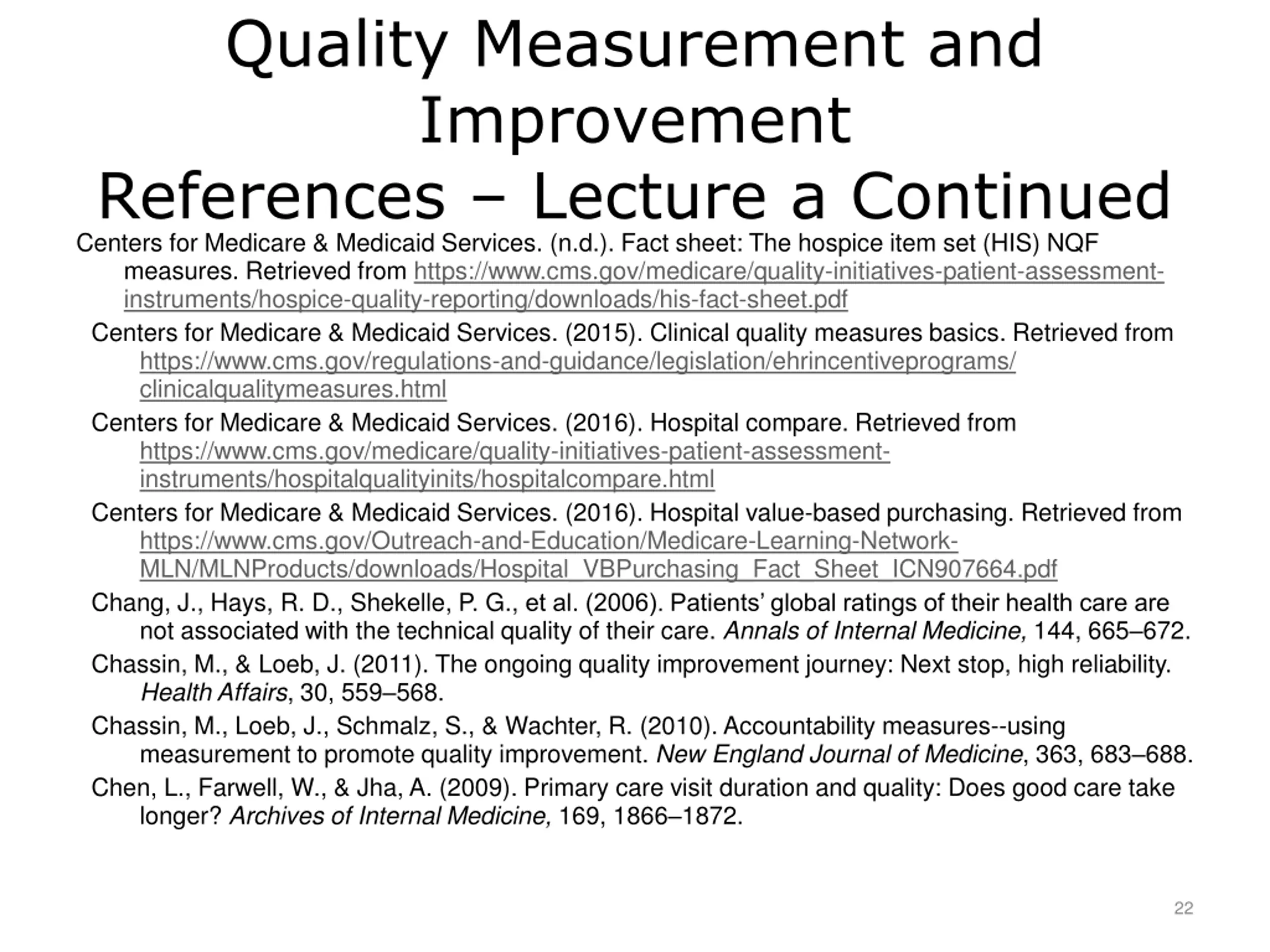 Quality Measurement and Improvement References Lecture a Continued Centers for Medicare & Medicaid Services. (n.d.). Fact sheet: The hospice item set (HIS) NQF measures. Retrieved from https://www.cms.gov/medicare/quality-initiatives-patient-assessment- instruments/hospice-quality-reporting/downloads/his-fact-sheet.pdf Centers for Medicare & Medicaid Services. (2015). Clinical quality measures basics. Retrieved from https://www.cms.gov/regulations-and-guidance/legislation/ehrincentiveprograms/ clinicalqualitymeasures.html Centers for Medicare & Medicaid Services. (2016). Hospital compare. Retrieved from https://www.cms.gov/medicare/quality-initiatives-patient-assessment- instruments/hospitalqualityinits/hospitalcompare.html Centers for Medicare & Medicaid Services. (2016). Hospital value-based purchasing. Retrieved from https://www.cms.gov/Outreach-and-Education/Medicare-Learning-Network- MLN/MLNProducts/downloads/Hospital_VBPurchasing_Fact_Sheet_ICN907664.pdf Chang, J., Hays, R. D., Shekelle, P. G., et al. (2006). Patients global ratings of their health care are not associated with the technical quality of their care. Annals of Internal Medicine, 144, 665 672. Chassin, M., & Loeb, J. (2011). The ongoing quality improvement journey: Next stop, high reliability. Health Affairs, 30, 559 568. Chassin, M., Loeb, J., Schmalz, S., & Wachter, R. (2010). Accountability measures--using measurement to promote quality improvement. New England Journal of Medicine, 363, 683 688. Chen, L., Farwell, W., & Jha, A. (2009). Primary care visit duration and quality: Does good care take longer? Archives of Internal Medicine, 169, 1866 1872. 22