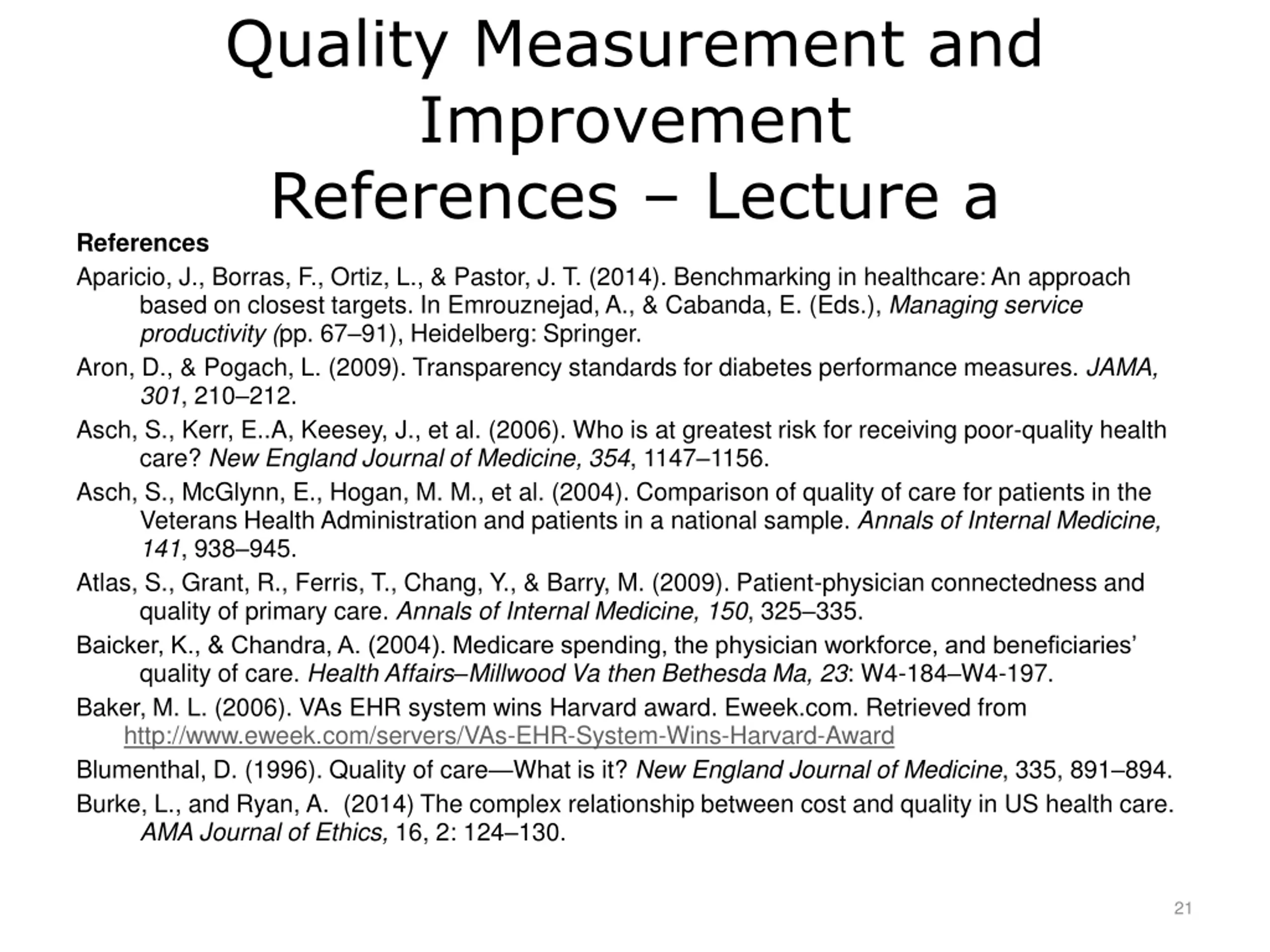 Quality Measurement and Improvement References Lecture a References Aparicio, J., Borras, F., Ortiz, L., & Pastor, J. T. (2014). Benchmarking in healthcare: An approach based on closest targets. In Emrouznejad, A., & Cabanda, E. (Eds.), Managing service productivity (pp. 67 91), Heidelberg: Springer. Aron, D., & Pogach, L. (2009). Transparency standards for diabetes performance measures. JAMA, 301, 210 212. Asch, S., Kerr, E..A, Keesey, J., et al. (2006). Who is at greatest risk for receiving poor-quality health care? New England Journal of Medicine, 354, 1147 1156. Asch, S., McGlynn, E., Hogan, M. M., et al. (2004). Comparison of quality of care for patients in the Veterans Health Administration and patients in a national sample. Annals of Internal Medicine, 141, 938 945. Atlas, S., Grant, R., Ferris, T., Chang, Y., & Barry, M. (2009). Patient-physician connectedness and quality of primary care. Annals of Internal Medicine, 150, 325 335. Baicker, K., & Chandra, A. (2004). Medicare spending, the physician workforce, and beneficiaries quality of care. Health Affairs Millwood Va then Bethesda Ma, 23: W4-184 W4-197. Baker, M. L. (2006). VAs EHR system wins Harvard award. Eweek.com. Retrieved from http://www.eweek.com/servers/VAs-EHR-System-Wins-Harvard-Award Blumenthal, D. (1996). Quality of care What is it? New England Journal of Medicine, 335, 891 894. Burke, L., and Ryan, A. (2014) The complex relationship between cost and quality in US health care. AMA Journal of Ethics, 16, 2: 124 130. 21