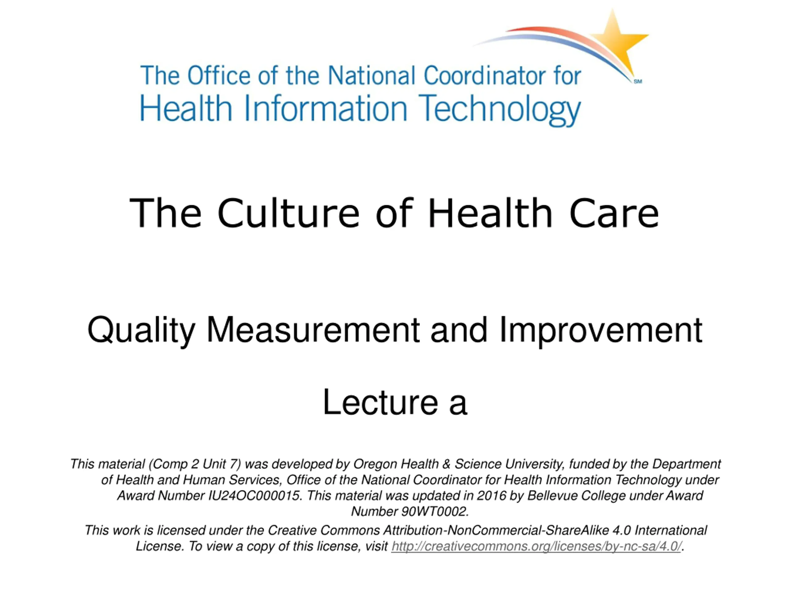The Culture of Health Care Quality Measurement and Improvement Lecture a This material (Comp 2 Unit 7) was developed by Oregon Health & Science University, funded by the Department of Health and Human Services, Office of the National Coordinator for Health Information Technology under Award Number IU24OC000015. This material was updated in 2016 by Bellevue College under Award Number 90WT0002. This work is licensed under the Creative Commons Attribution-NonCommercial-ShareAlike 4.0 International License. To view a copy of this license, visit http://creativecommons.org/licenses/by-nc-sa/4.0/.