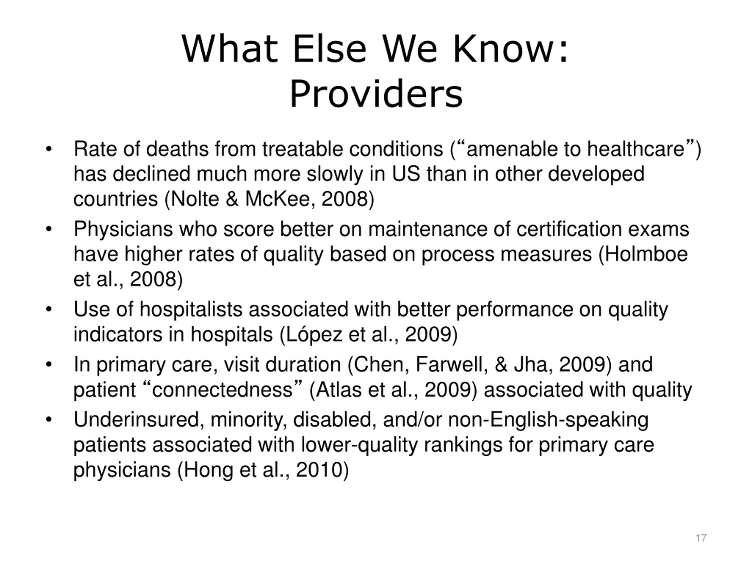 What Else We Know: Providers Rate of deaths from treatable conditions ( amenable to healthcare ) has declined much more slowly in US than in other developed countries (Nolte & McKee, 2008) Physicians who score better on maintenance of certification exams have higher rates of quality based on process measures (Holmboe et al., 2008) Use of hospitalists associated with better performance on quality indicators in hospitals (L pez et al., 2009) In primary care, visit duration (Chen, Farwell, & Jha, 2009) and patient connectedness (Atlas et al., 2009) associated with quality Underinsured, minority, disabled, and/or non-English-speaking patients associated with lower-quality rankings for primary care physicians (Hong et al., 2010) 17