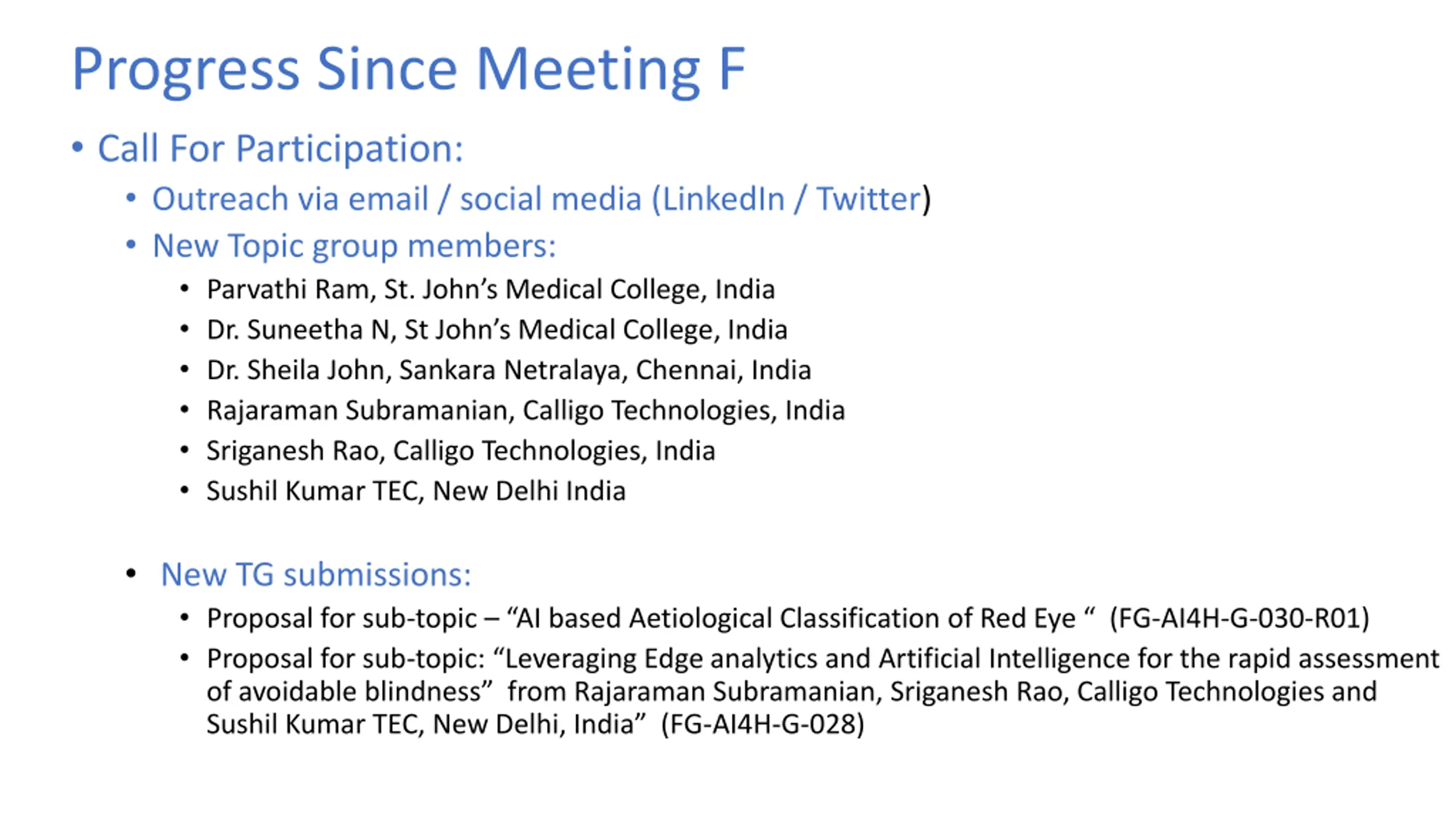 Progress Since Meeting F Call For Participation: Outreach via email / social media (LinkedIn / Twitter) New Topic group members: Parvathi Ram, St. John s Medical College, India Dr. Suneetha N, St John s Medical College, India Dr. Sheila John, Sankara Netralaya, Chennai, India Rajaraman Subramanian, Calligo Technologies, India Sriganesh Rao, Calligo Technologies, India Sushil Kumar TEC, New Delhi India New TG submissions: Proposal for sub-topic AI based Aetiological Classification of Red Eye (FG-AI4H-G-030-R01) Proposal for sub-topic: Leveraging Edge analytics and Artificial Intelligence for the rapid assessment of avoidable blindness from Rajaraman Subramanian, Sriganesh Rao, Calligo Technologies and Sushil Kumar TEC, New Delhi, India (FG-AI4H-G-028)