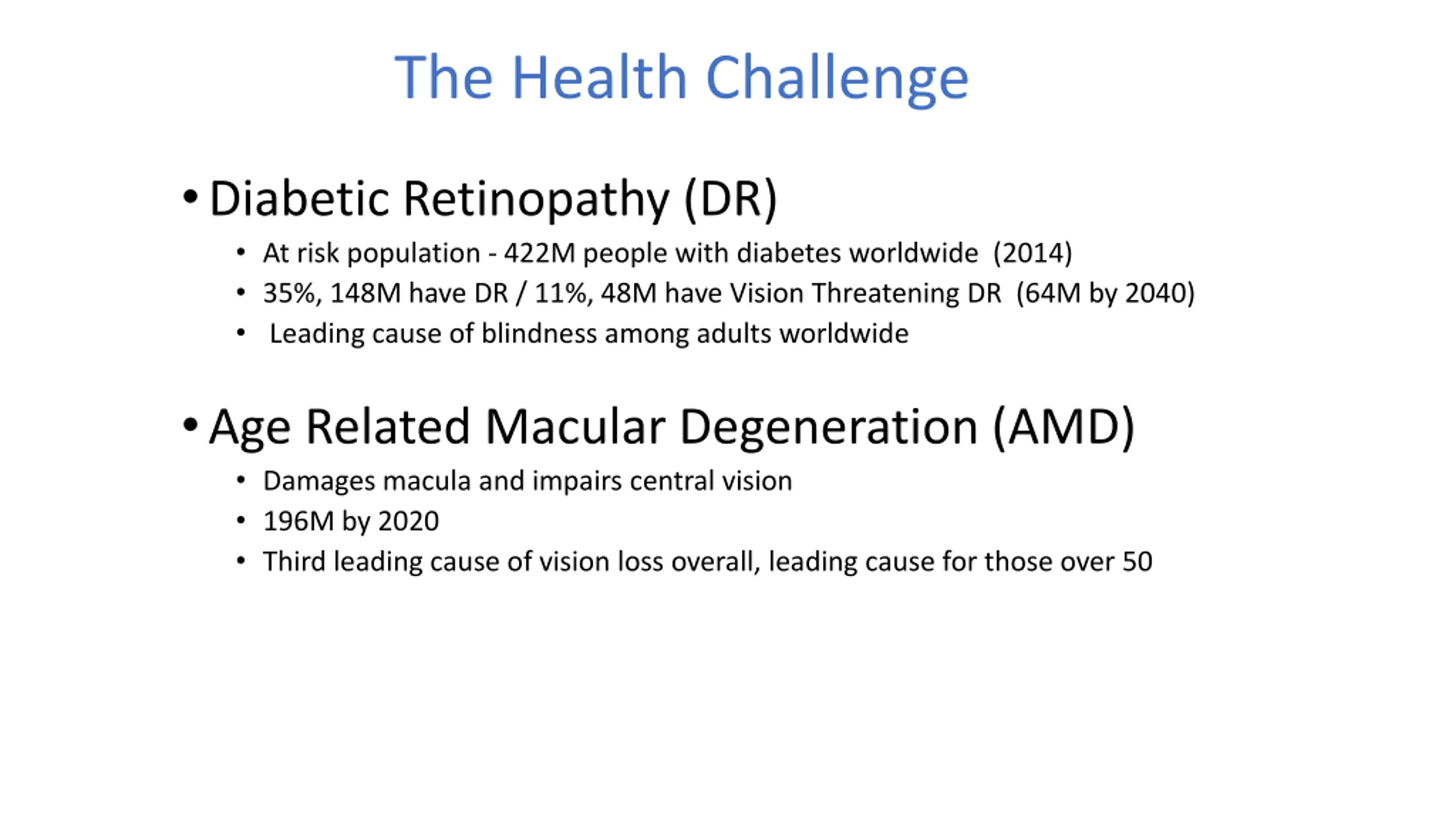 The Health Challenge Diabetic Retinopathy (DR) At risk population - 422M people with diabetes worldwide (2014) 35%, 148M have DR / 11%, 48M have Vision Threatening DR (64M by 2040) Leading cause of blindness among adults worldwide Age Related Macular Degeneration (AMD) Damages macula and impairs central vision 196M by 2020 Third leading cause of vision loss overall, leading cause for those over 50