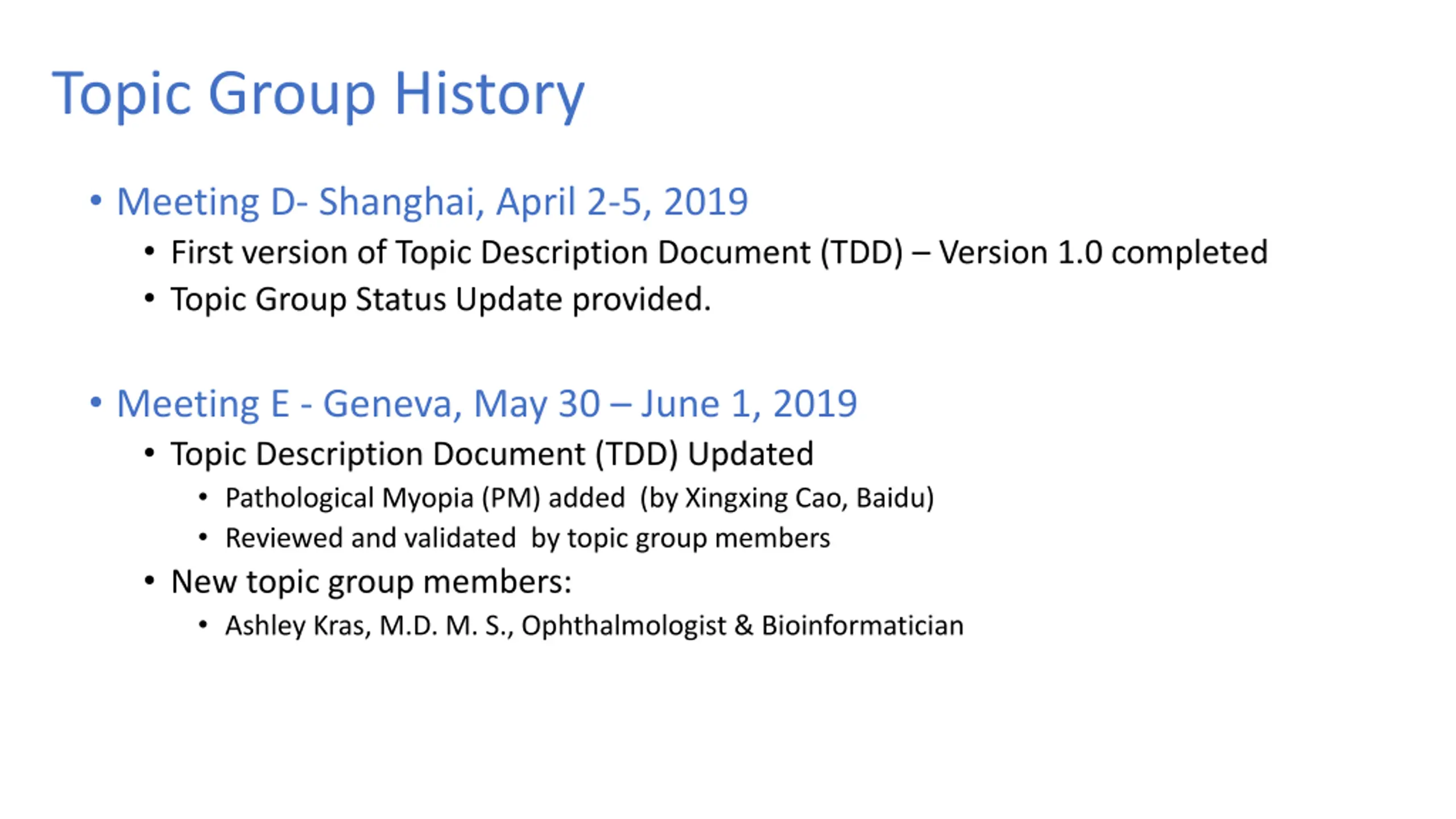 Topic Group History Meeting D- Shanghai, April 2-5, 2019 First version of Topic Description Document (TDD) Version 1.0 completed Topic Group Status Update provided. Meeting E - Geneva, May 30 June 1, 2019 Topic Description Document (TDD) Updated Pathological Myopia (PM) added (by Xingxing Cao, Baidu) Reviewed and validated by topic group members New topic group members: Ashley Kras, M.D. M. S., Ophthalmologist & Bioinformatician