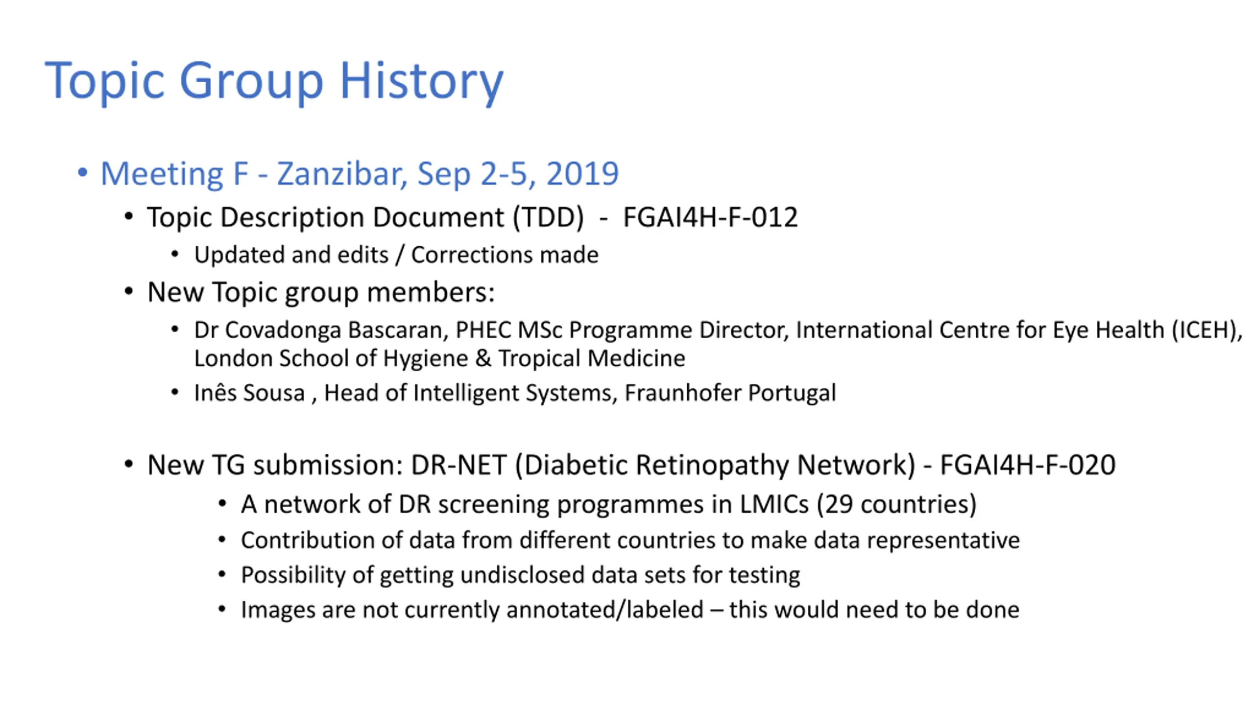 Topic Group History Meeting F - Zanzibar, Sep 2-5, 2019 Topic Description Document (TDD) - FGAI4H-F-012 Updated and edits / Corrections made New Topic group members: Dr Covadonga Bascaran, PHEC MSc Programme Director, International Centre for Eye Health (ICEH), London School of Hygiene & Tropical Medicine In s Sousa , Head of Intelligent Systems, Fraunhofer Portugal New TG submission: DR-NET (Diabetic Retinopathy Network) - FGAI4H-F-020 A network of DR screening programmes in LMICs (29 countries) Contribution of data from different countries to make data representative Possibility of getting undisclosed data sets for testing Images are not currently annotated/labeled this would need to be done