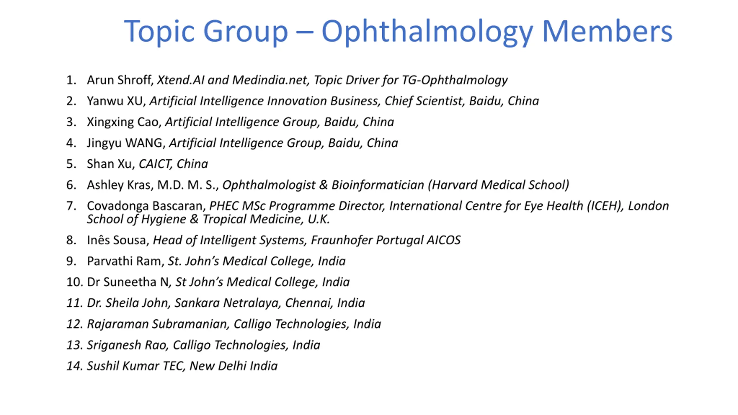 Topic Group Ophthalmology Members 1. Arun Shroff, Xtend.AI and Medindia.net, Topic Driver for TG-Ophthalmology 2. Yanwu XU, Artificial Intelligence Innovation Business, Chief Scientist, Baidu, China 3. Xingxing Cao, Artificial Intelligence Group, Baidu, China 4. Jingyu WANG, Artificial Intelligence Group, Baidu, China 5. Shan Xu, CAICT, China 6. Ashley Kras, M.D. M. S., Ophthalmologist & Bioinformatician (Harvard Medical School) 7. Covadonga Bascaran, PHEC MSc Programme Director, International Centre for Eye Health (ICEH), London School of Hygiene & Tropical Medicine, U.K. 8. In s Sousa, Head of Intelligent Systems, Fraunhofer Portugal AICOS 9. Parvathi Ram, St. John s Medical College, India 10. Dr Suneetha N, St John s Medical College, India 11. Dr. Sheila John, Sankara Netralaya, Chennai, India 12. Rajaraman Subramanian, Calligo Technologies, India 13. Sriganesh Rao, Calligo Technologies, India 14. Sushil Kumar TEC, New Delhi India