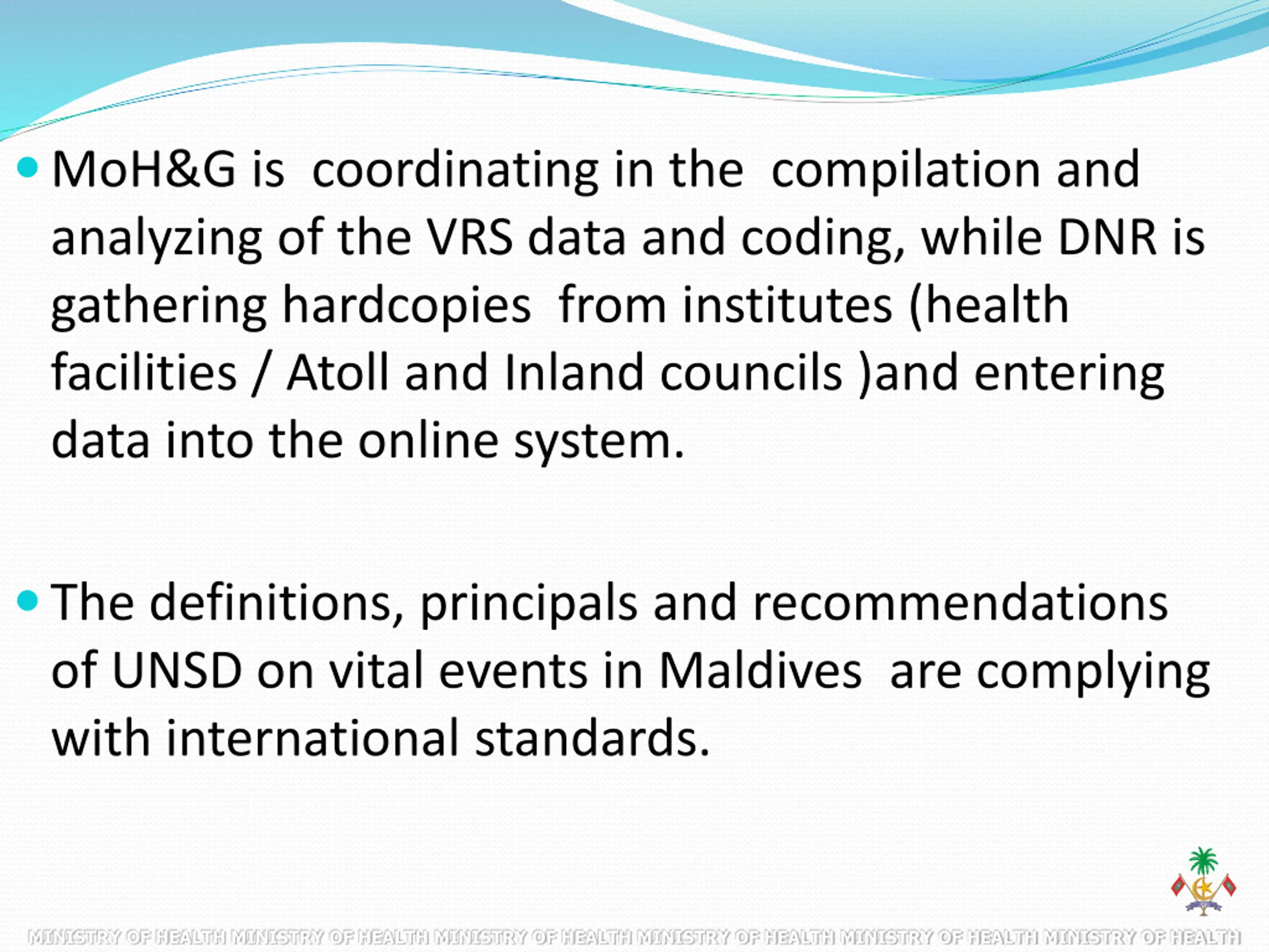MoH&G is coordinating in the compilation and analyzing of the VRS data and coding, while DNR is gathering hardcopies from institutes (health facilities / Atoll and Inland councils )and entering data into the online system. The definitions, principals and recommendations of UNSD on vital events in Maldives are complying with international standards. MINISTRY OF HEALTH MINISTRY OF HEALTH MINISTRY OF HEALTH MINISTRY OF HEALTH MINISTRY OF HEALTH MINISTRY OF HEALTH