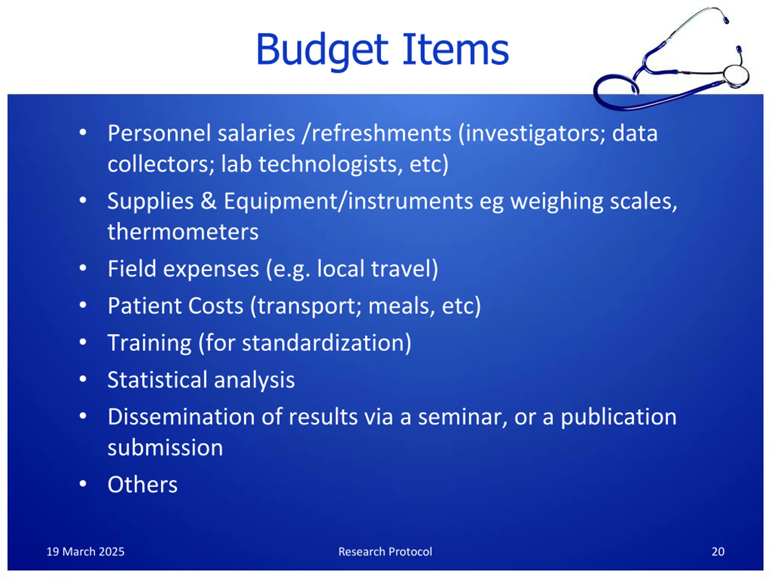 Budget Items Personnel salaries /refreshments (investigators; data collectors; lab technologists, etc) Supplies & Equipment/instruments eg weighing scales, thermometers Field expenses (e.g. local travel) Patient Costs (transport; meals, etc) Training (for standardization) Statistical analysis Dissemination of results via a seminar, or a publication submission Others 19 March 2025 Research Protocol 20