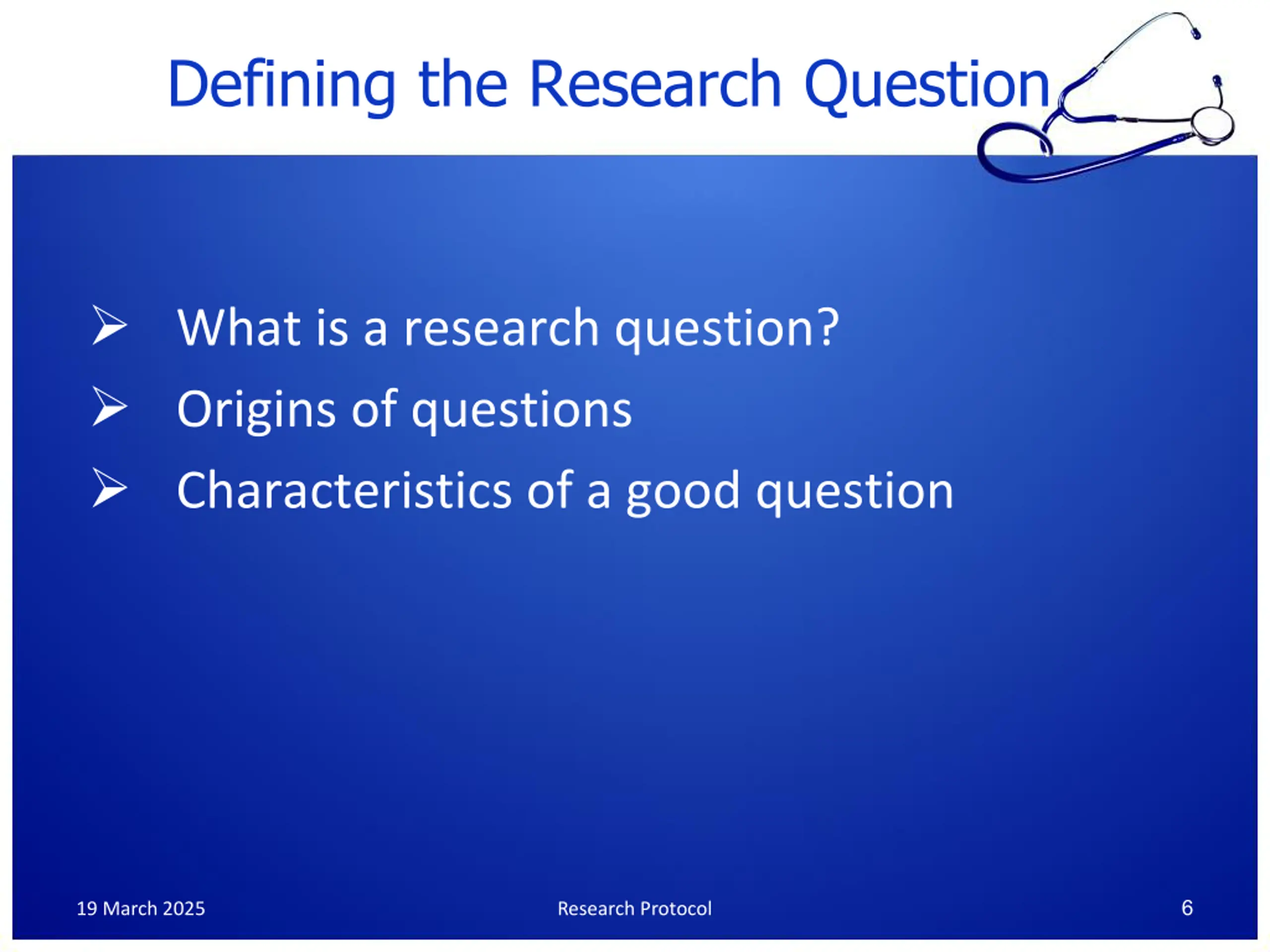Defining the Research Question What is a research question? Origins of questions Characteristics of a good question 6 19 March 2025 Research Protocol