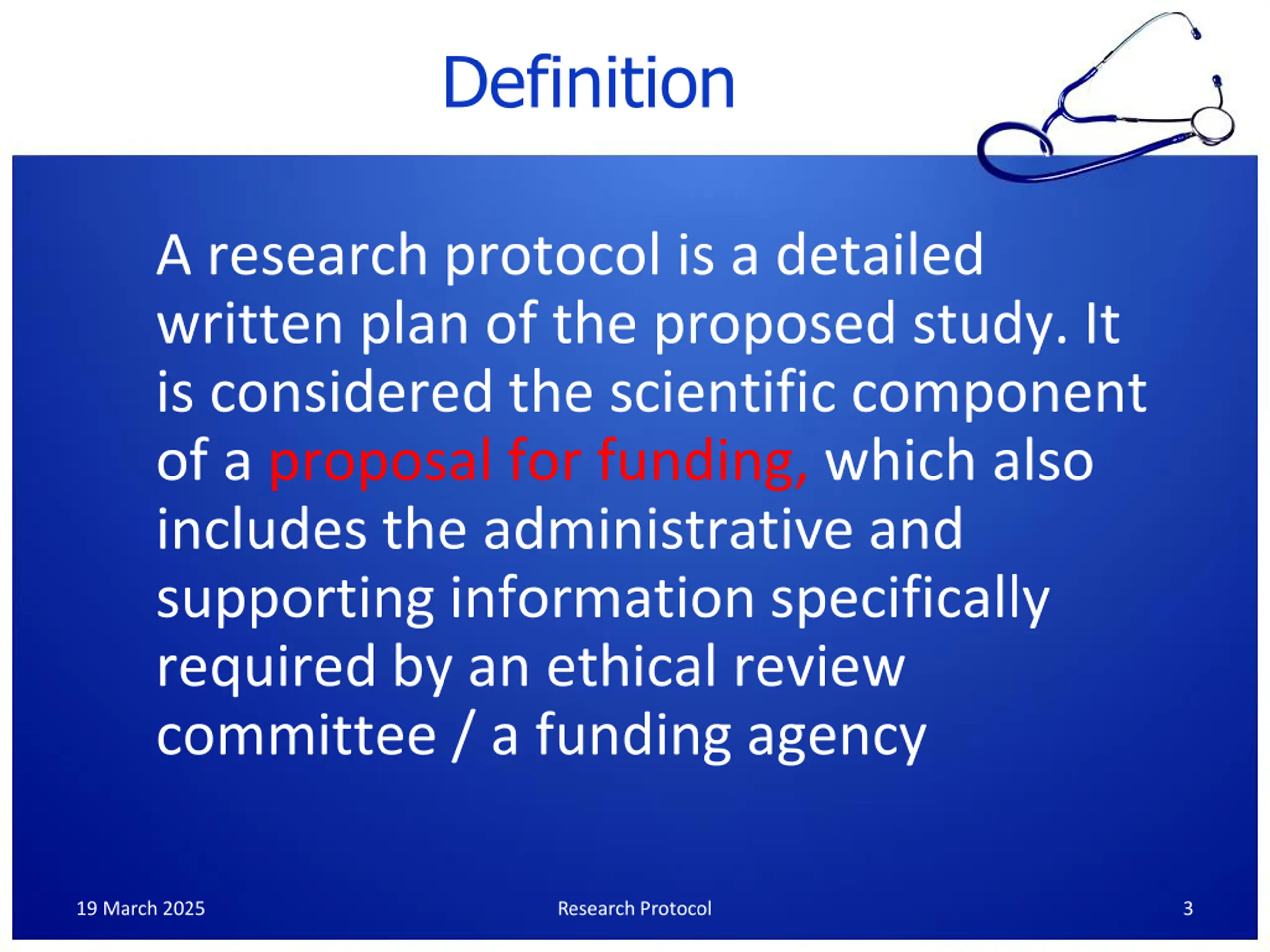 Definition A research protocol is a detailed written plan of the proposed study. It is considered the scientific component of a proposal for funding, which also includes the administrative and supporting information specifically required by an ethical review committee / a funding agency 19 March 2025 Research Protocol 3