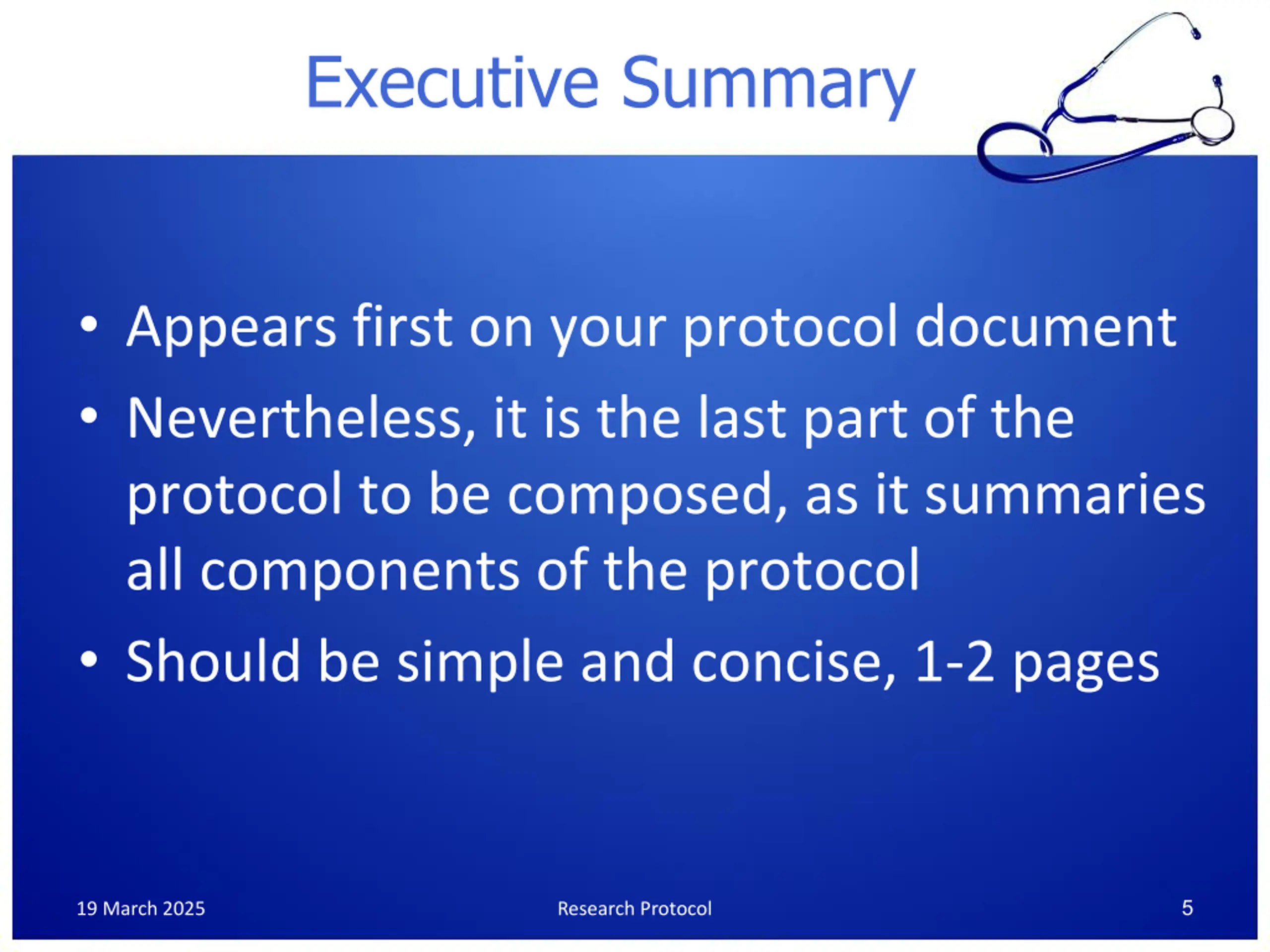 Executive Summary Appears first on your protocol document Nevertheless, it is the last part of the protocol to be composed, as it summaries all components of the protocol Should be simple and concise, 1-2 pages 5 19 March 2025 Research Protocol