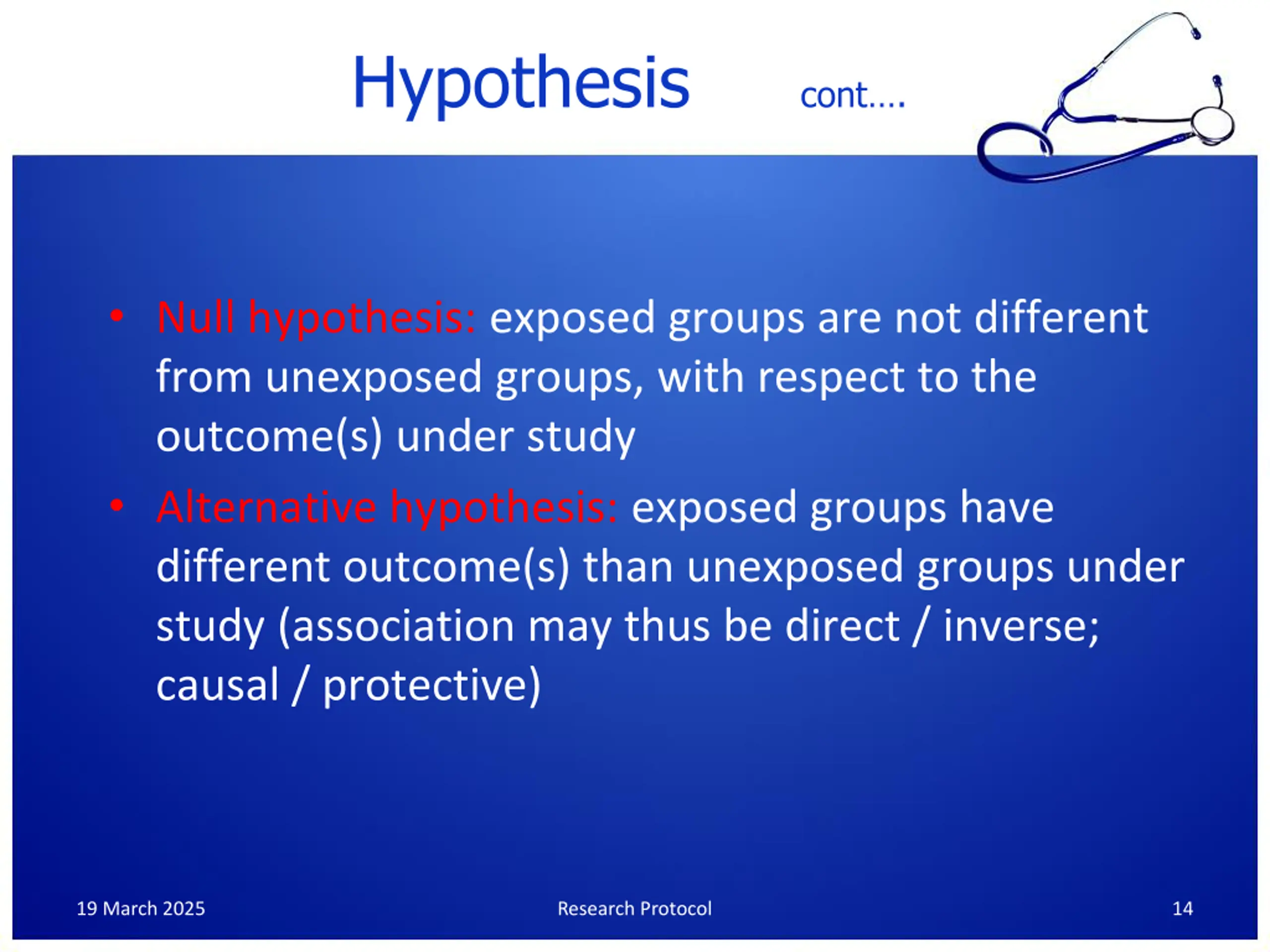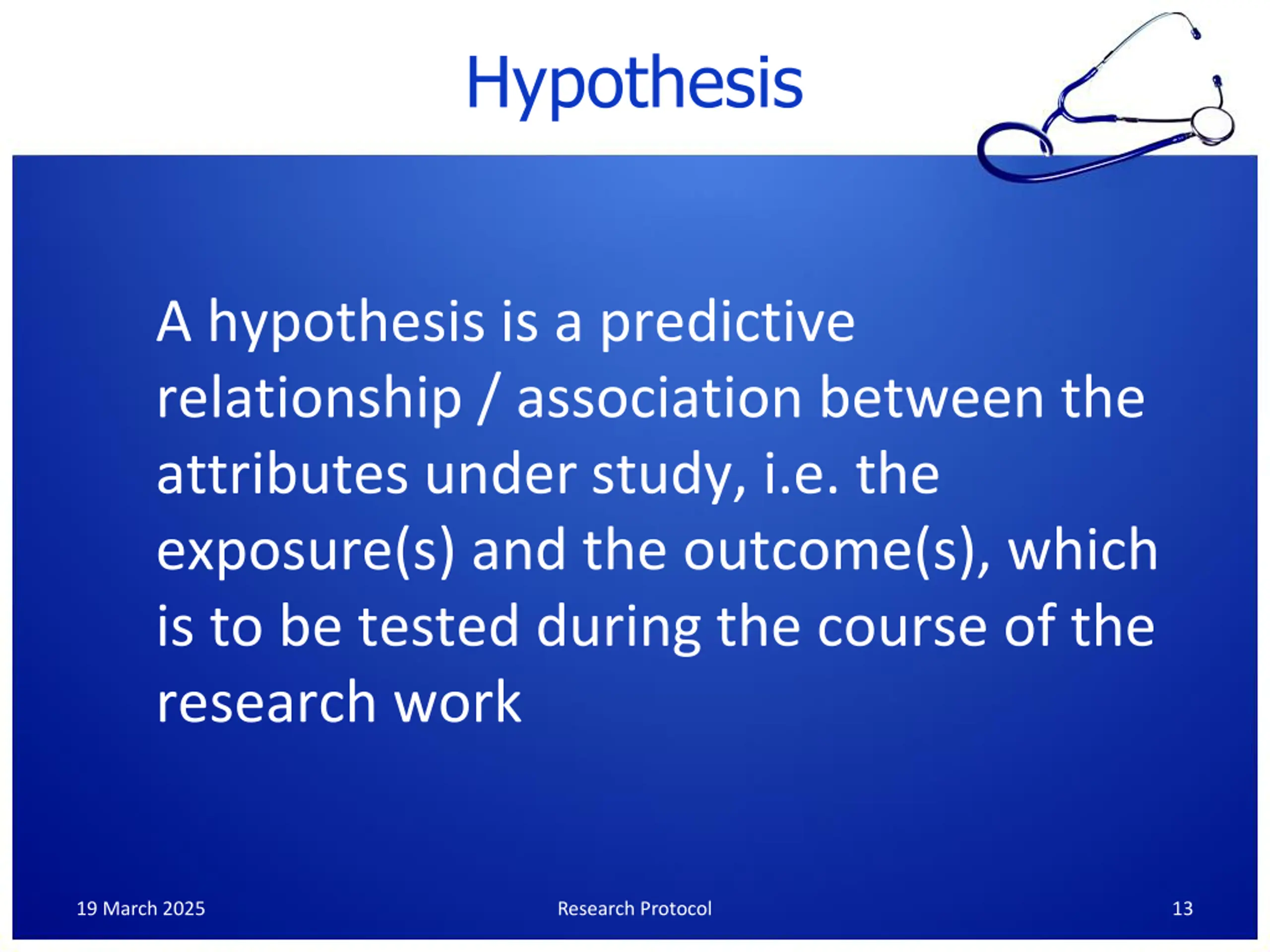 Hypothesis A hypothesis is a predictive relationship / association between the attributes under study, i.e. the exposure(s) and the outcome(s), which is to be tested during the course of the research work 19 March 2025 Research Protocol 13