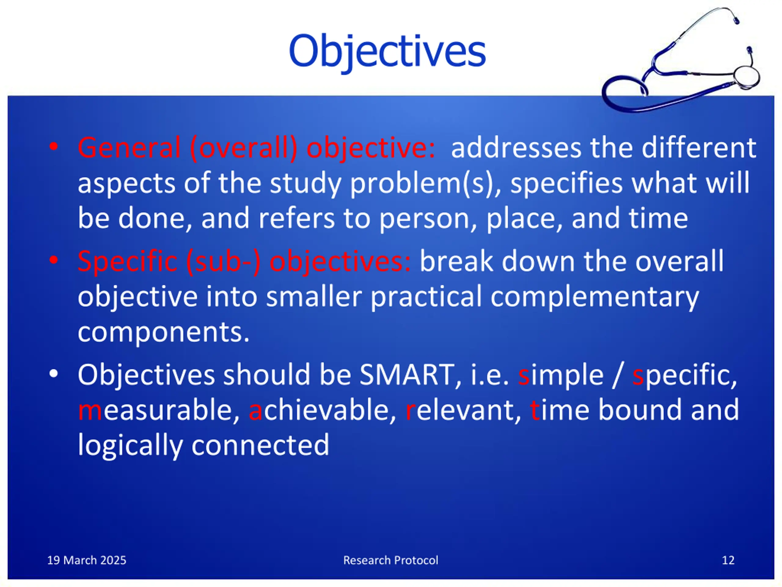 Rationale May be referred to as: statement of need Reasons for carrying out the study include: Investigating a problem of public health importance Filling an important gap in the literature Fulfilling strategic plans Addressing local / national priorities Responding to calls for proposals, by funding agencies 19 March 2025 Research Protocol 11