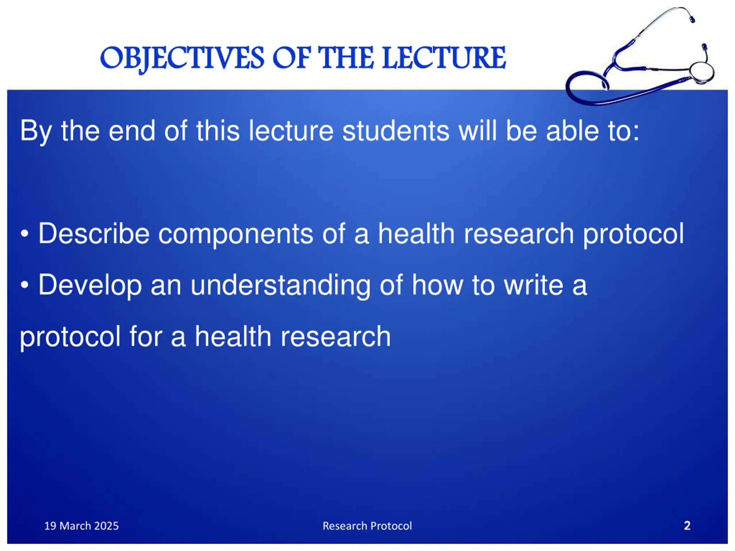 OBJECTIVES OF THE LECTURE OBJECTIVES OF THE LECTURE By the end of this lecture students will be able to: Describe components of a health research protocol Develop an understanding of how to write a protocol for a health research 2 2 19 March 2025 Research Protocol