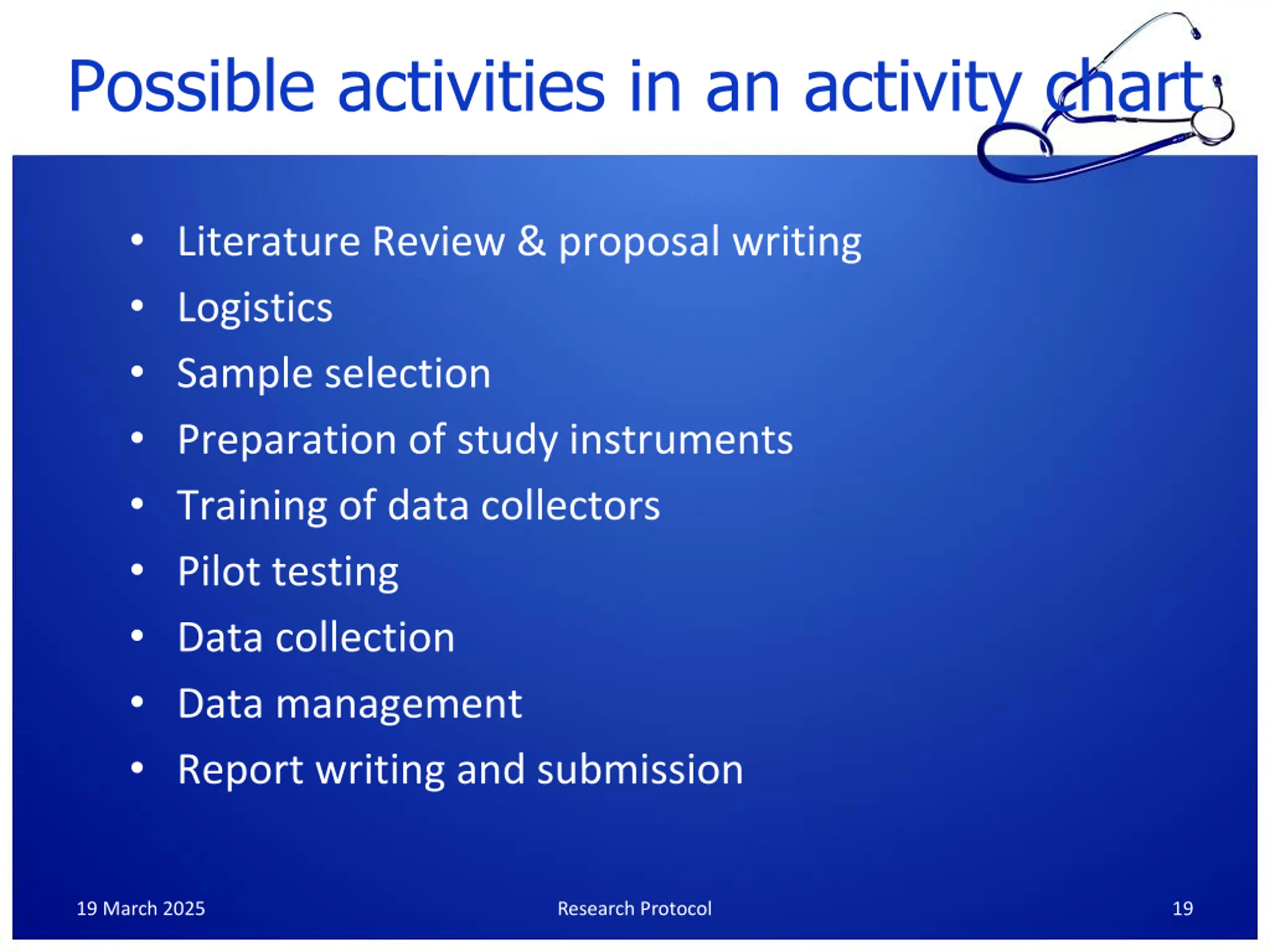 Possible activities in an activity chart Literature Review & proposal writing Logistics Sample selection Preparation of study instruments Training of data collectors Pilot testing Data collection Data management Report writing and submission 19 March 2025 Research Protocol 19