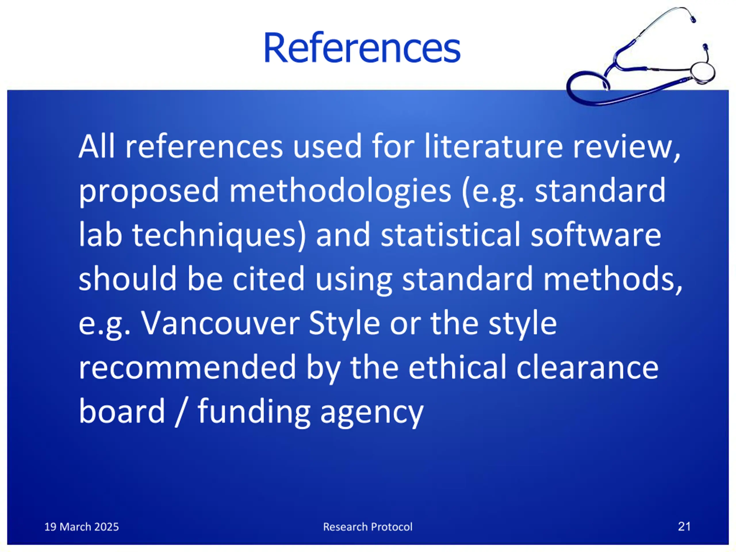 References All references used for literature review, proposed methodologies (e.g. standard lab techniques) and statistical software should be cited using standard methods, e.g. Vancouver Style or the style recommended by the ethical clearance board / funding agency 21 19 March 2025 Research Protocol