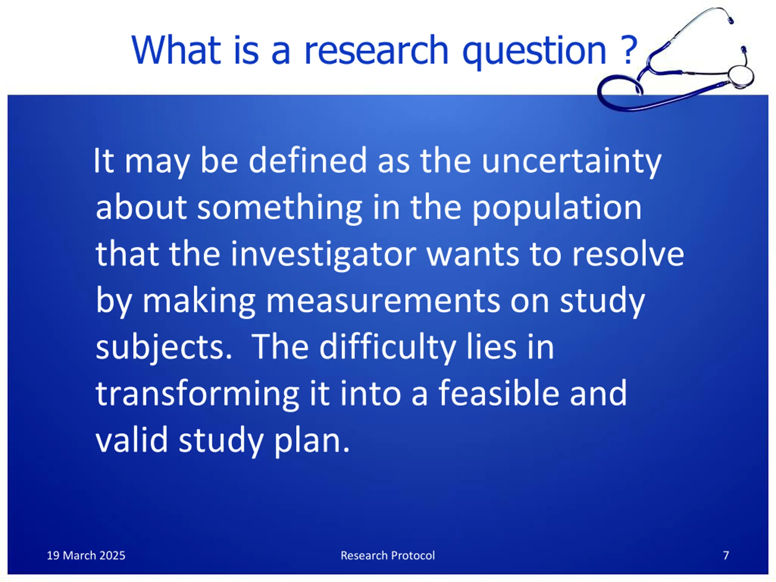 What is a research question ? It may be defined as the uncertainty about something in the population that the investigator wants to resolve by making measurements on study subjects. The difficulty lies in transforming it into a feasible and valid study plan. 19 March 2025 Research Protocol 7
