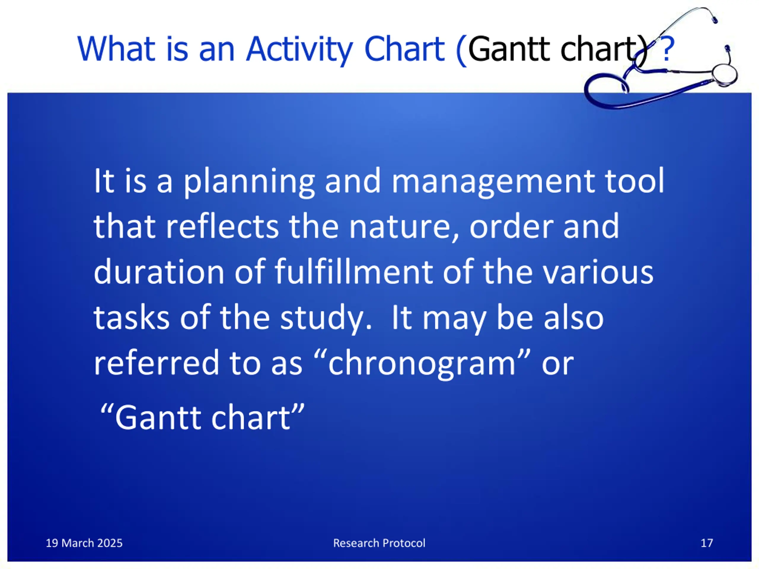 What is an Activity Chart (Gantt chart) ? It is a planning and management tool that reflects the nature, order and duration of fulfillment of the various tasks of the study. It may be also referred to as chronogram or Gantt chart 19 March 2025 Research Protocol 17