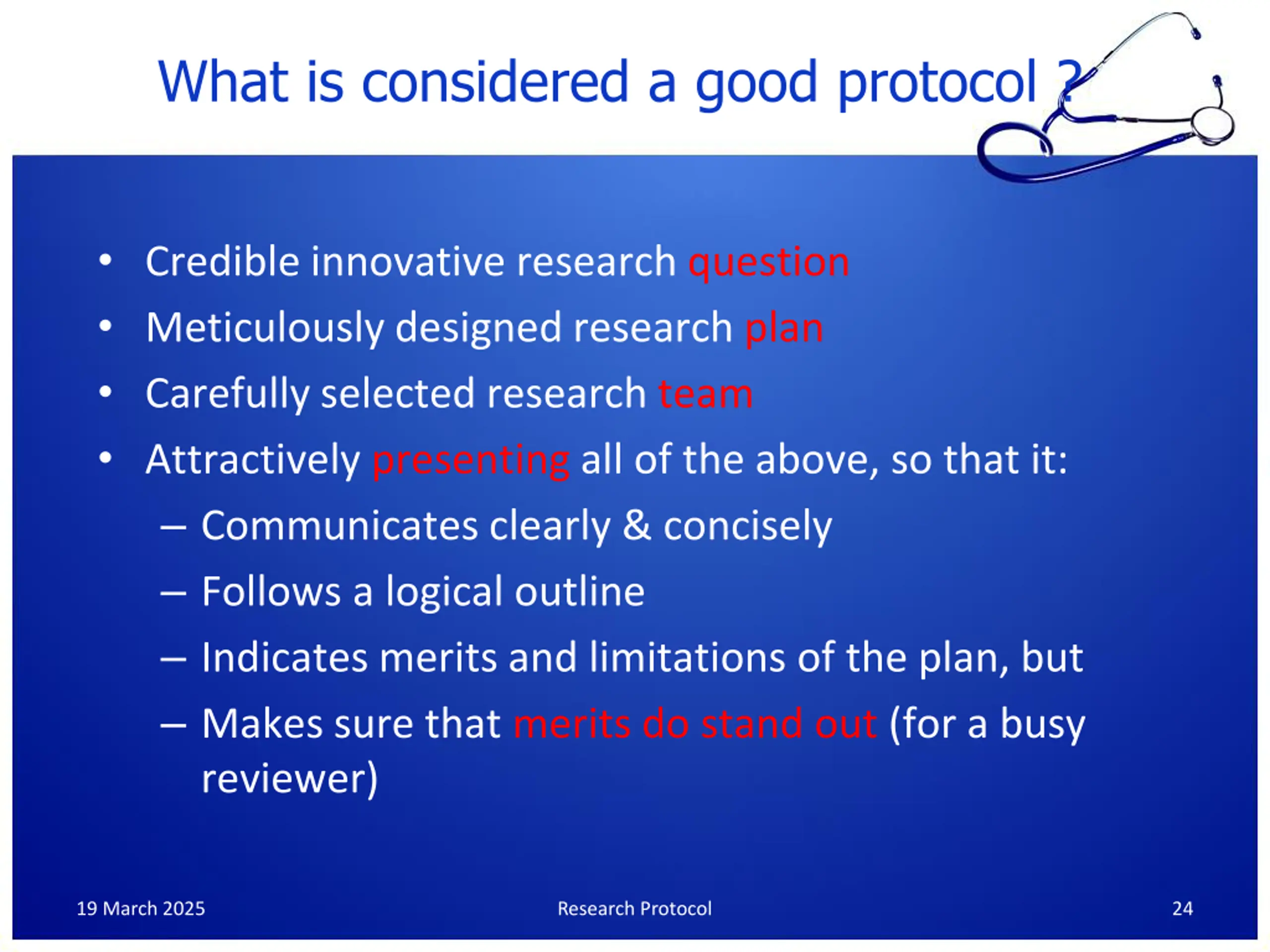 What is considered a good protocol ? Credible innovative research question Meticulously designed research plan Carefully selected research team Attractively presenting all of the above, so that it: Communicates clearly & concisely Follows a logical outline Indicates merits and limitations of the plan, but Makes sure that merits do stand out (for a busy reviewer) 19 March 2025 Research Protocol 24