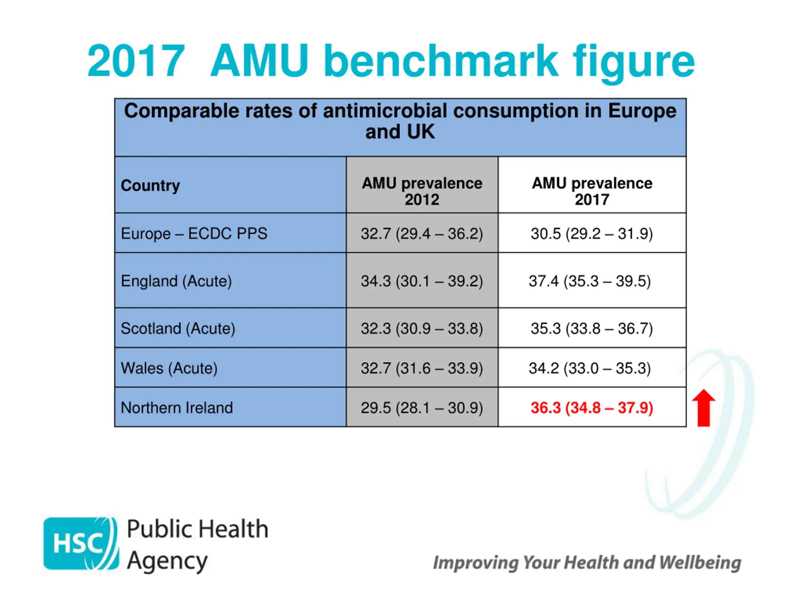 2017 AMU benchmark figure Comparable rates of antimicrobial consumption in Europe and UK AMU prevalence 2012 AMU prevalence 2017 Country Europe ECDC PPS 32.7 (29.4 36.2) 30.5 (29.2 31.9) England (Acute) 34.3 (30.1 39.2) 37.4 (35.3 39.5) Scotland (Acute) 32.3 (30.9 33.8) 35.3 (33.8 36.7) Wales (Acute) 32.7 (31.6 33.9) 34.2 (33.0 35.3) Northern Ireland 29.5 (28.1 30.9) 36.3 (34.8 37.9)