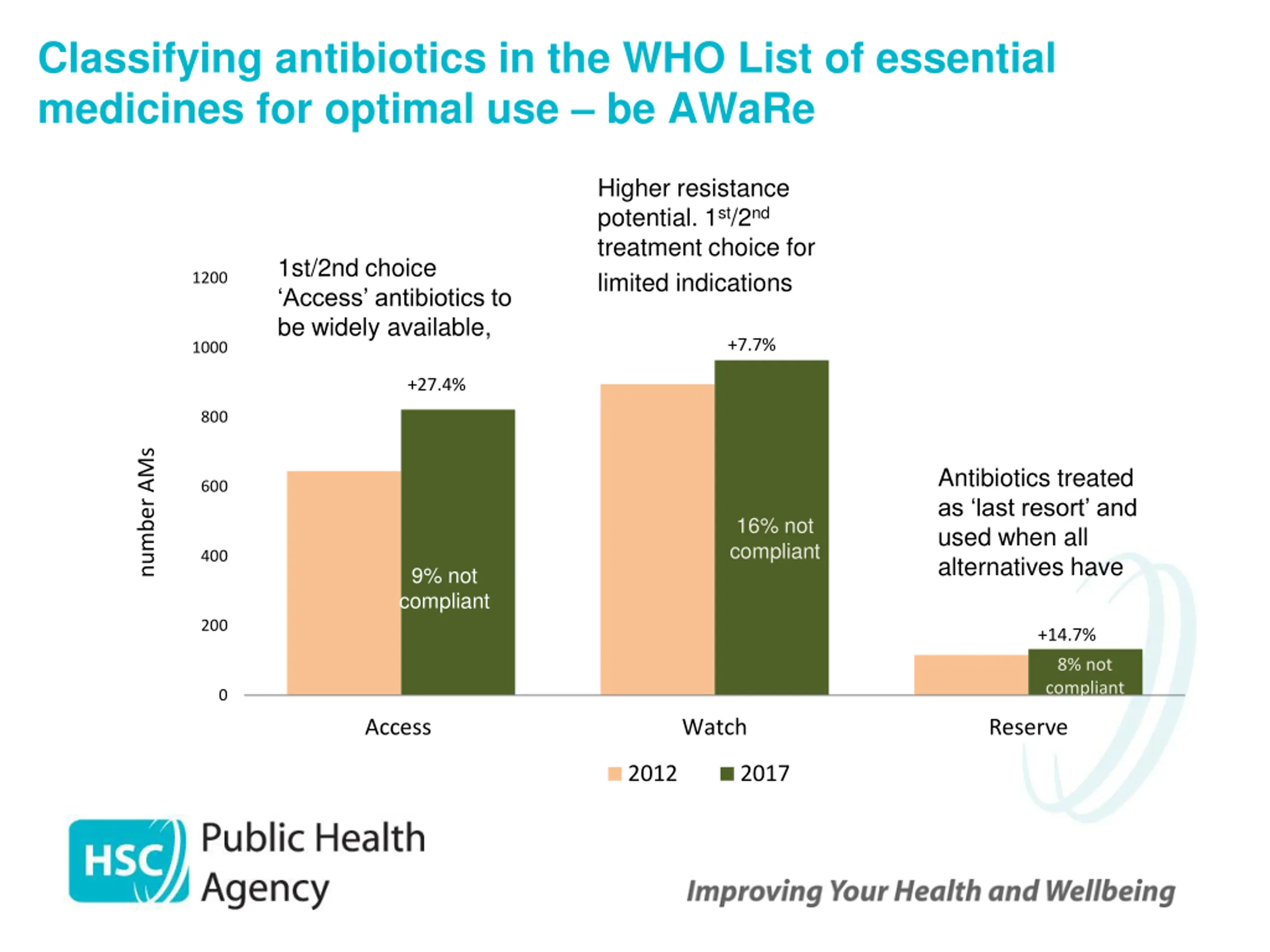 Classifying antibiotics in the WHO List of essential medicines for optimal use be AWaRe Higher resistance potential. 1st/2nd treatment choice for limited indications 1st/2nd choice Access antibiotics to be widely available, 1200 +7.7% 1000 +27.4% 800 number AMs Antibiotics treated as last resort and used when all alternatives have 600 16% not compliant 400 9% not compliant 200 +14.7% 8% not compliant 0 Access Watch Reserve 2012 2017