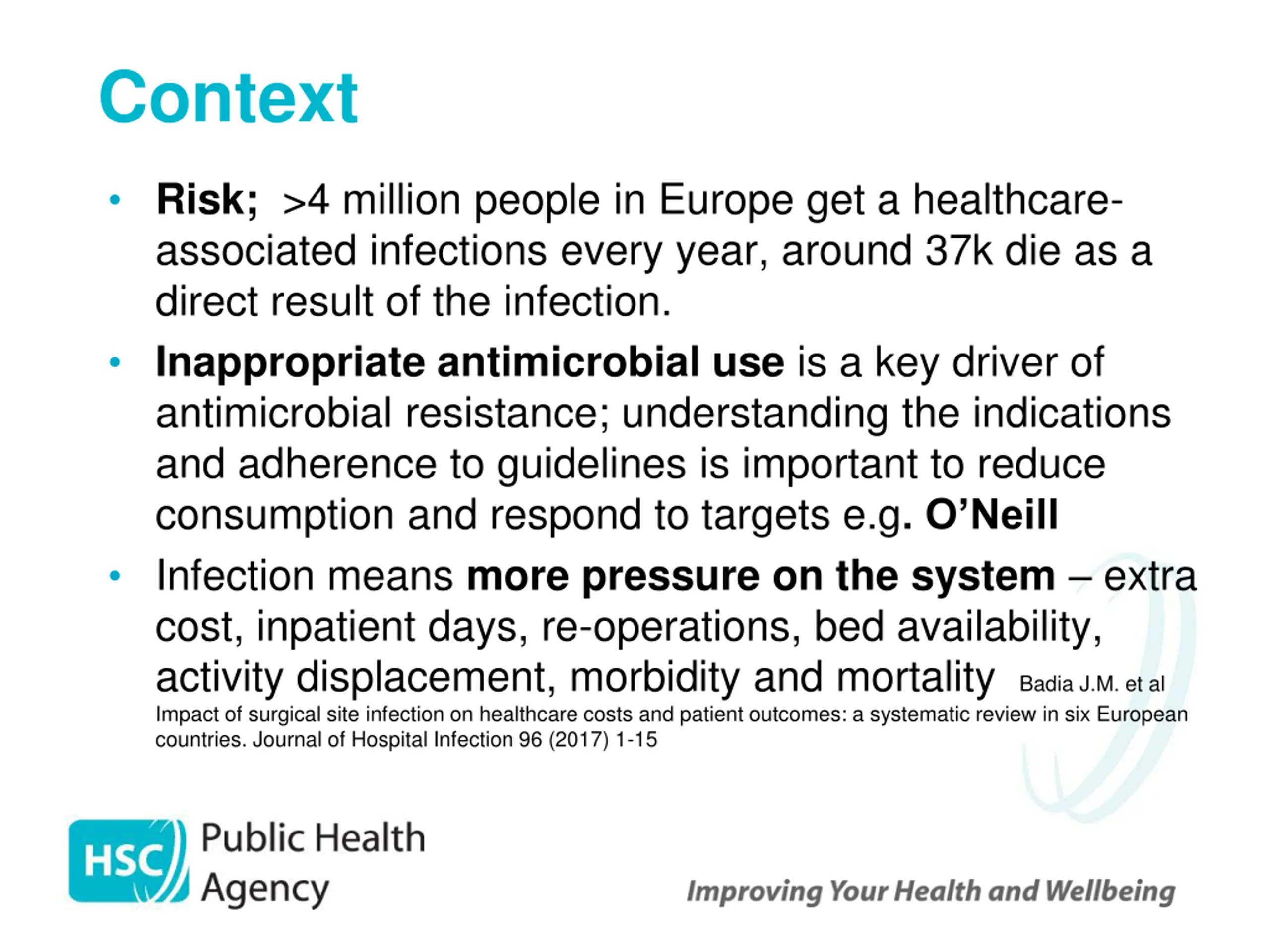 Context Risk; >4 million people in Europe get a healthcare- associated infections every year, around 37k die as a direct result of the infection. Inappropriate antimicrobial use is a key driver of antimicrobial resistance; understanding the indications and adherence to guidelines is important to reduce consumption and respond to targets e.g. O Neill Infection means more pressure on the system extra cost, inpatient days, re-operations, bed availability, activity displacement, morbidity and mortality Badia J.M. et al Impact of surgical site infection on healthcare costs and patient outcomes: a systematic review in six European countries. Journal of Hospital Infection 96 (2017) 1-15