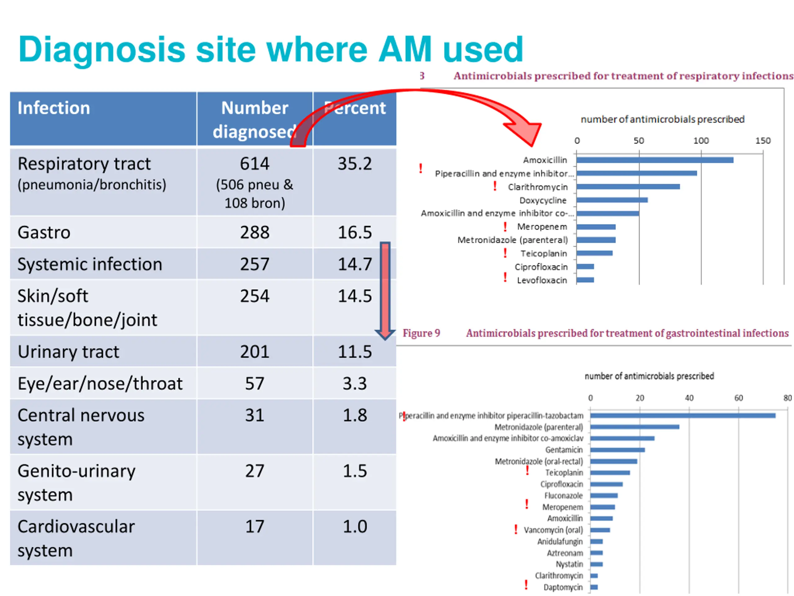 DiagnosissitewhereAMused Infection Number diagnosed Percent Respiratory tract (pneumonia/bronchitis) 614 35.2 ! (506 pneu & 108 bron) ! ! Gastro 288 16.5 ! Systemic infection 257 14.7 ! Skin/soft tissue/bone/joint 254 14.5 Urinary tract 201 11.5 Eye/ear/nose/throat 57 3.3 Central nervous system 31 1.8 ! Genito-urinary system 27 1.5 ! ! Cardiovascular system 17 1.0 ! !