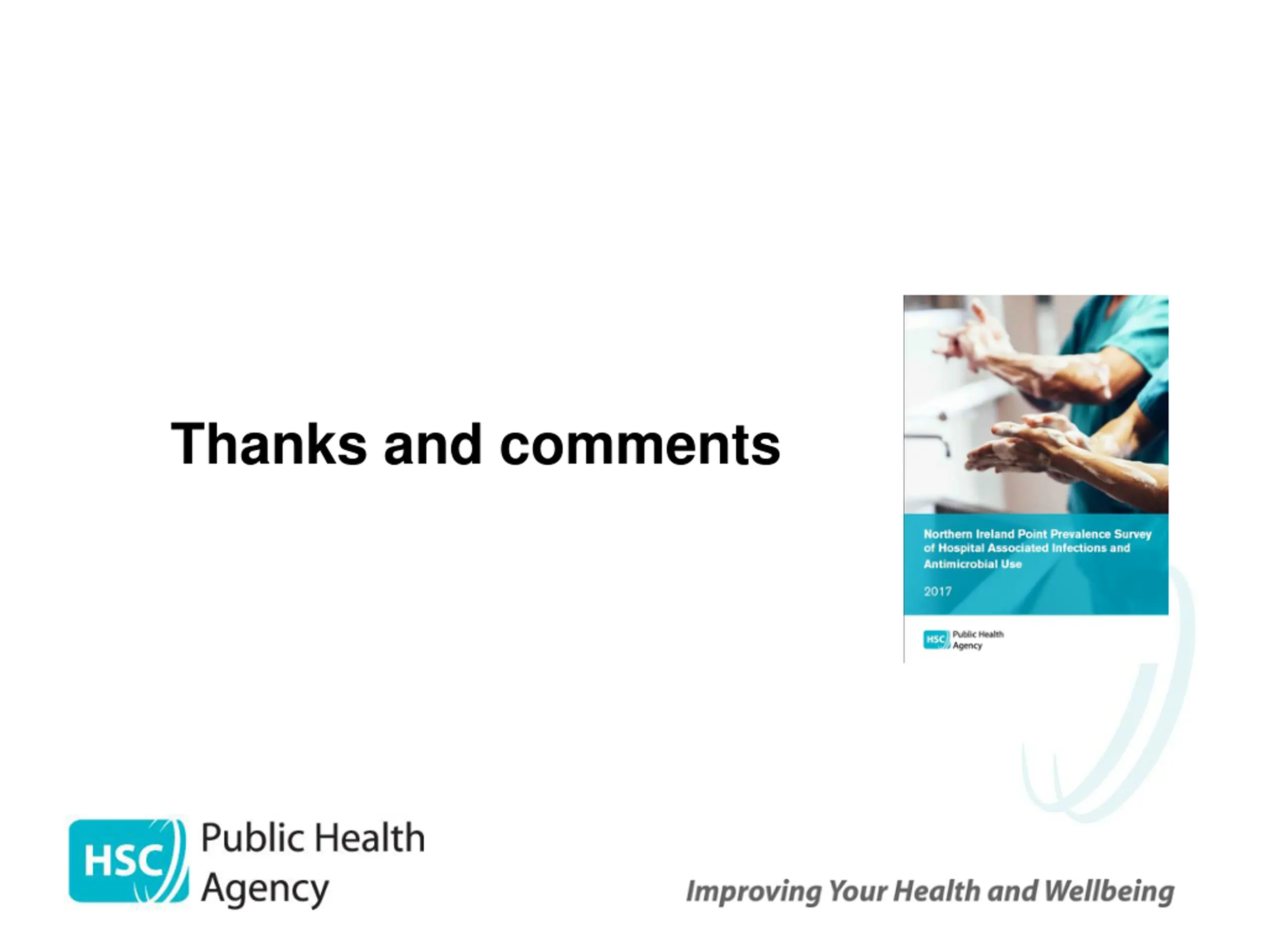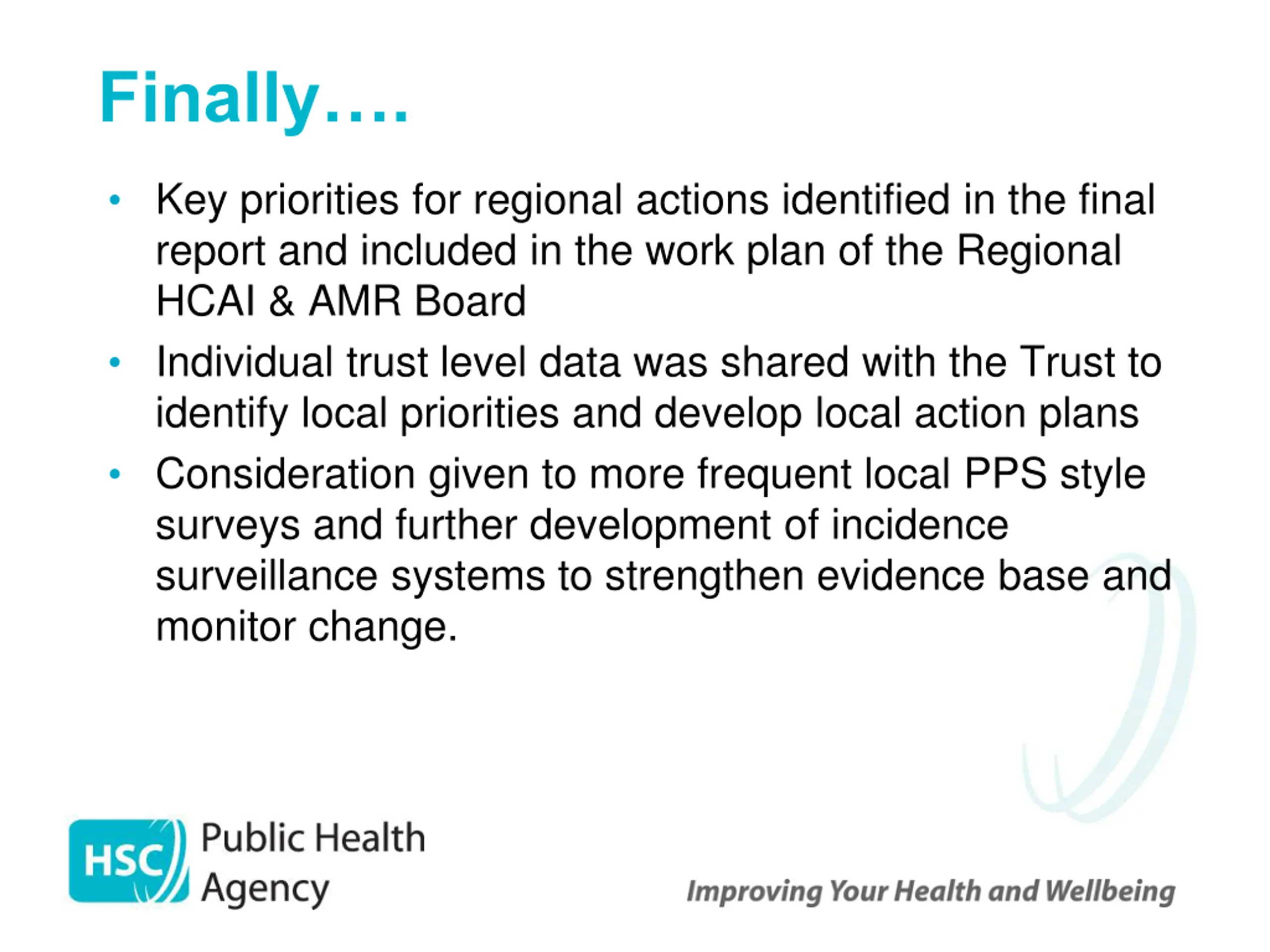 Finally. Key priorities for regional actions identified in the final report and included in the work plan of the Regional HCAI & AMR Board Individual trust level data was shared with the Trust to identify local priorities and develop local action plans Consideration given to more frequent local PPS style surveys and further development of incidence surveillance systems to strengthen evidence base and monitor change.