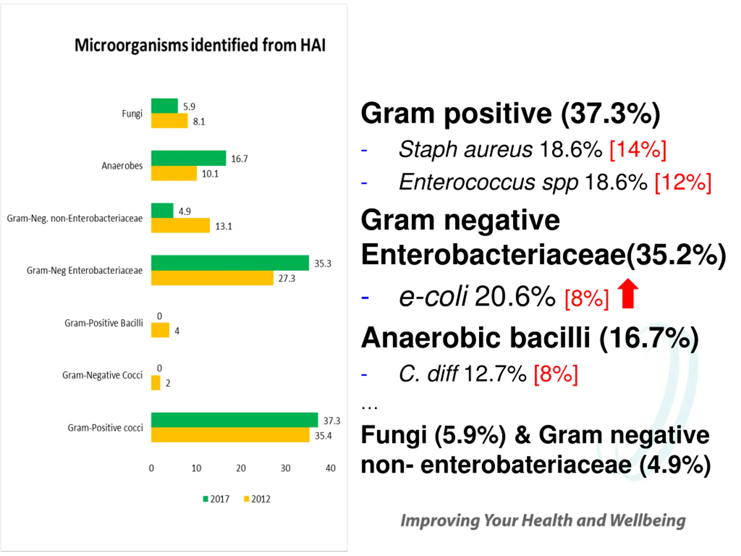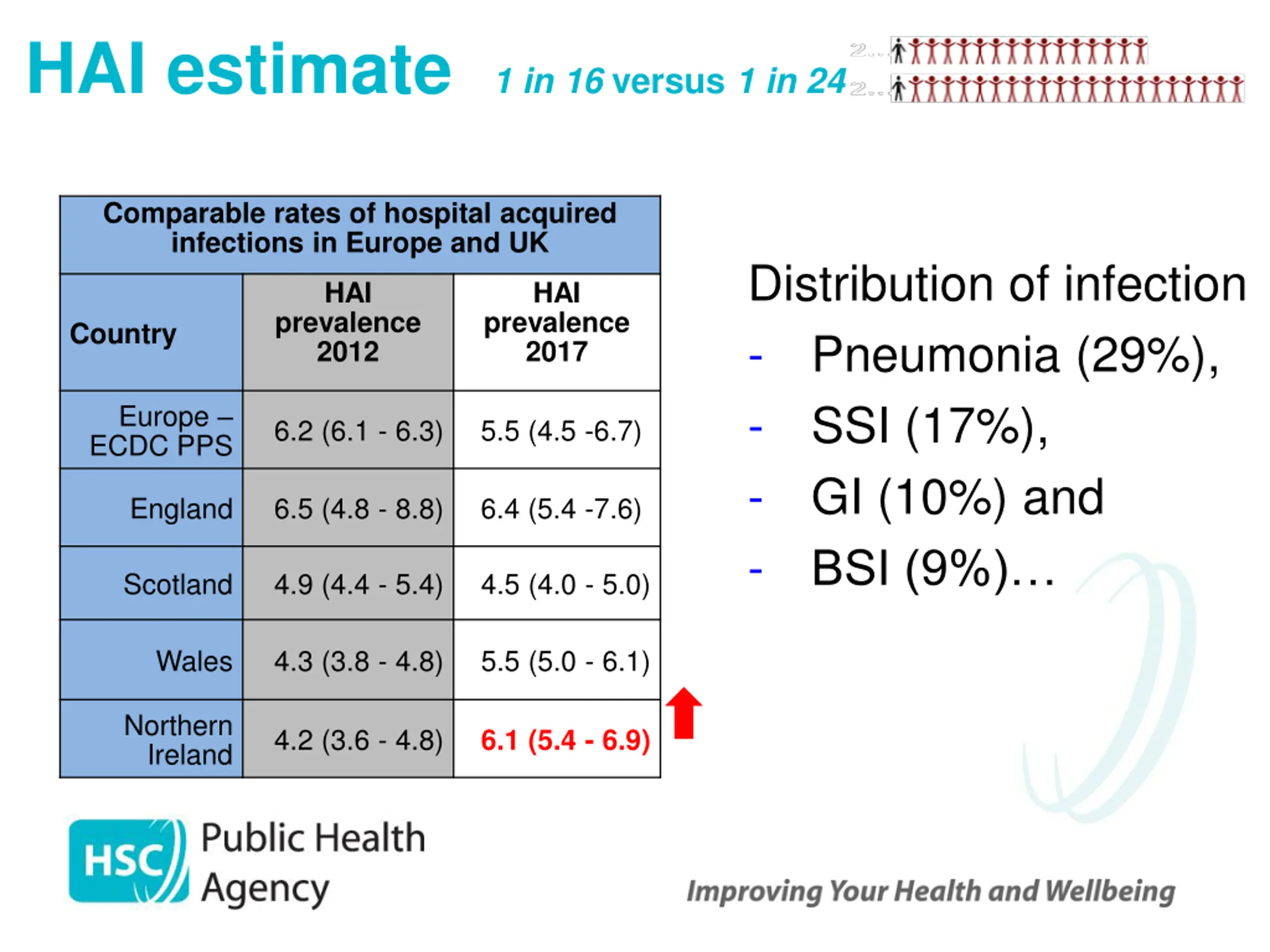HAI estimate 1 in 16 versus 1 in 24 Comparable rates of hospital acquired infections in Europe and UK Distribution of infection - Pneumonia (29%), - SSI (17%), - GI (10%) and - BSI (9%) HAI HAI prevalence 2012 prevalence 2017 Country Europe ECDC PPS 6.2 (6.1 - 6.3) 5.5 (4.5 -6.7) England 6.5 (4.8 - 8.8) 6.4 (5.4 -7.6) Scotland 4.9 (4.4 - 5.4) 4.5 (4.0 - 5.0) Wales 4.3 (3.8 - 4.8) 5.5 (5.0 - 6.1) Northern Ireland 4.2 (3.6 - 4.8) 6.1 (5.4 - 6.9)
