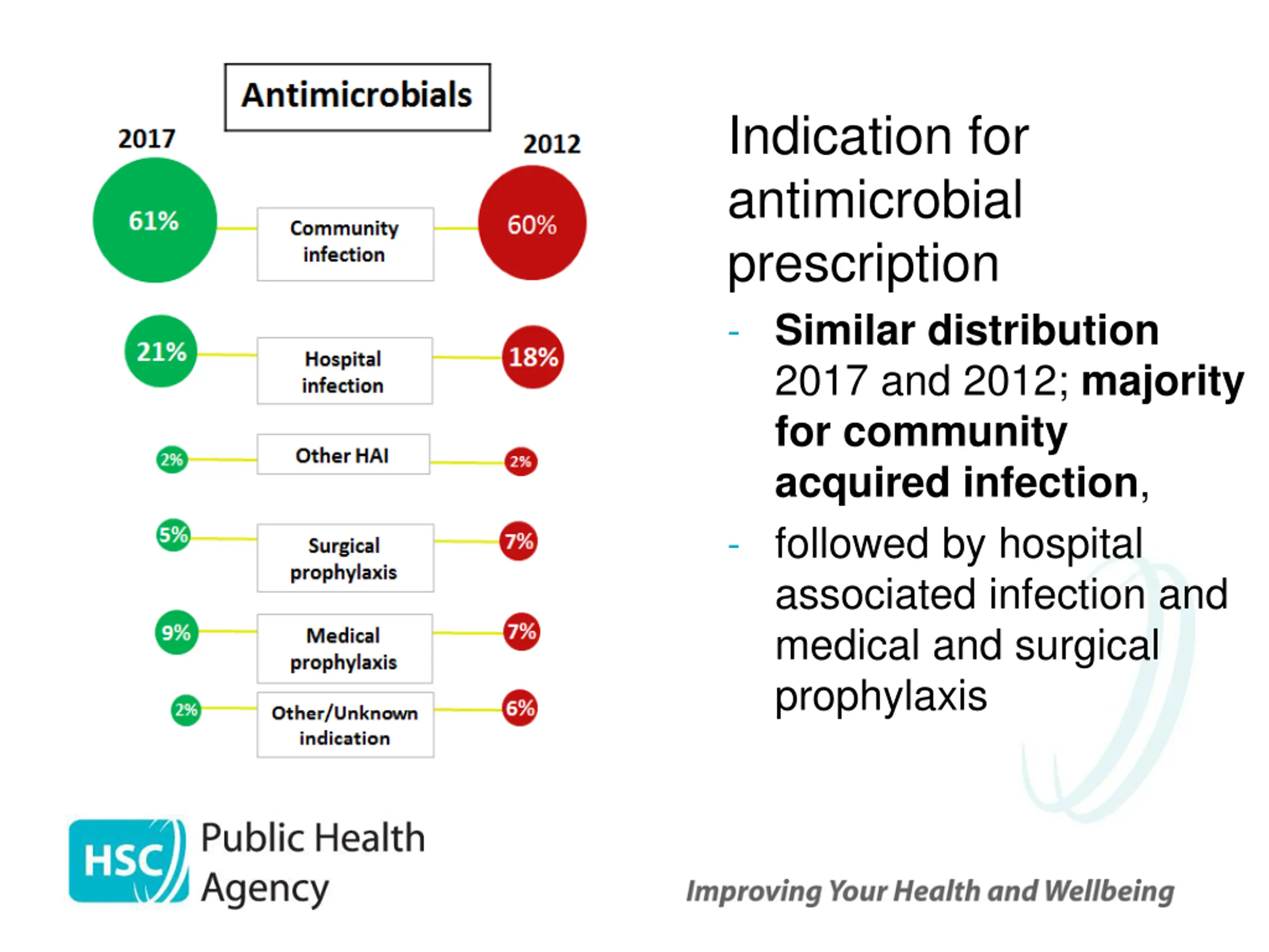 Indication for antimicrobial prescription - Similar distribution 2017 and 2012; majority for community acquired infection, - followed by hospital associated infection and medical and surgical prophylaxis