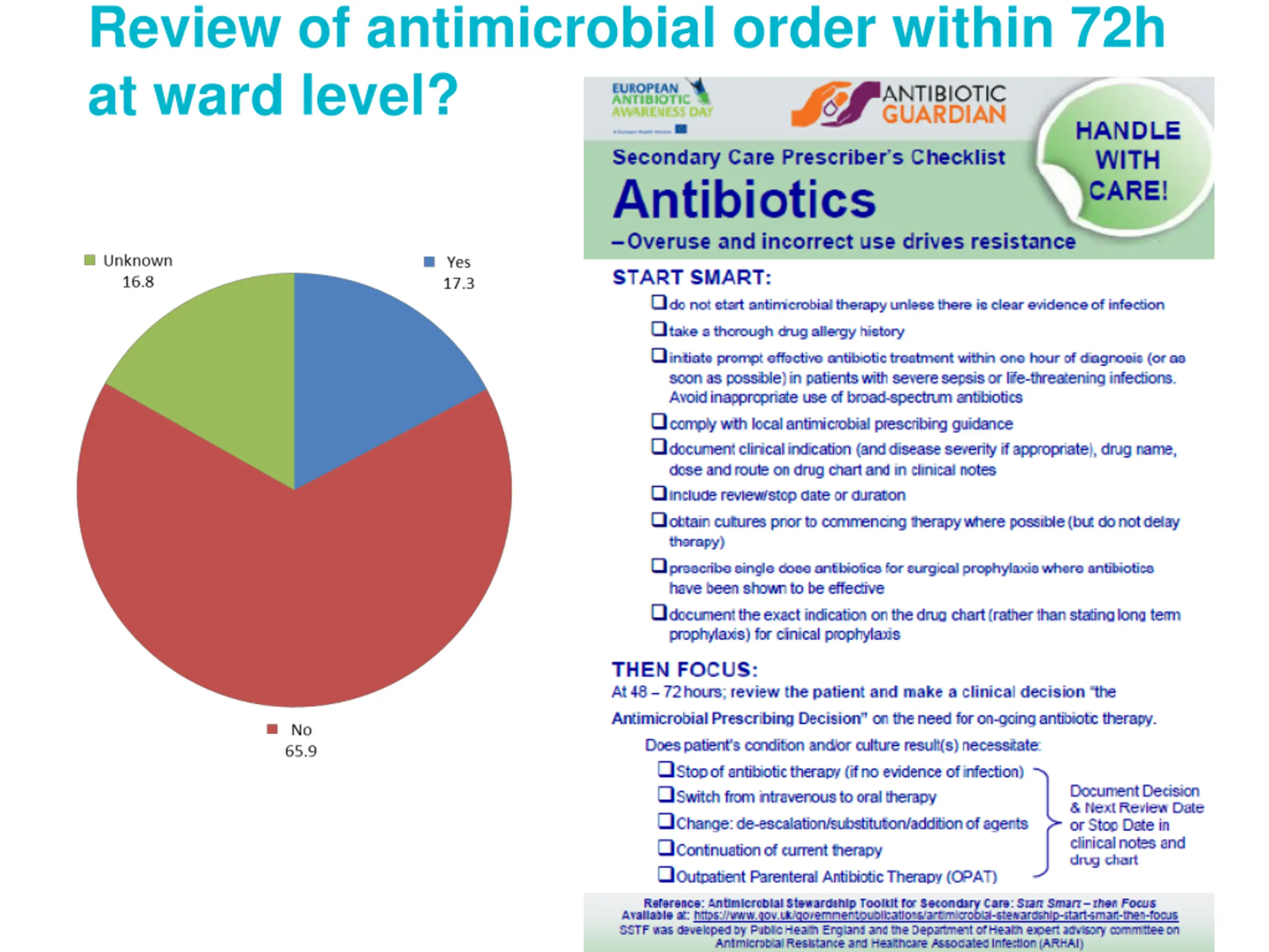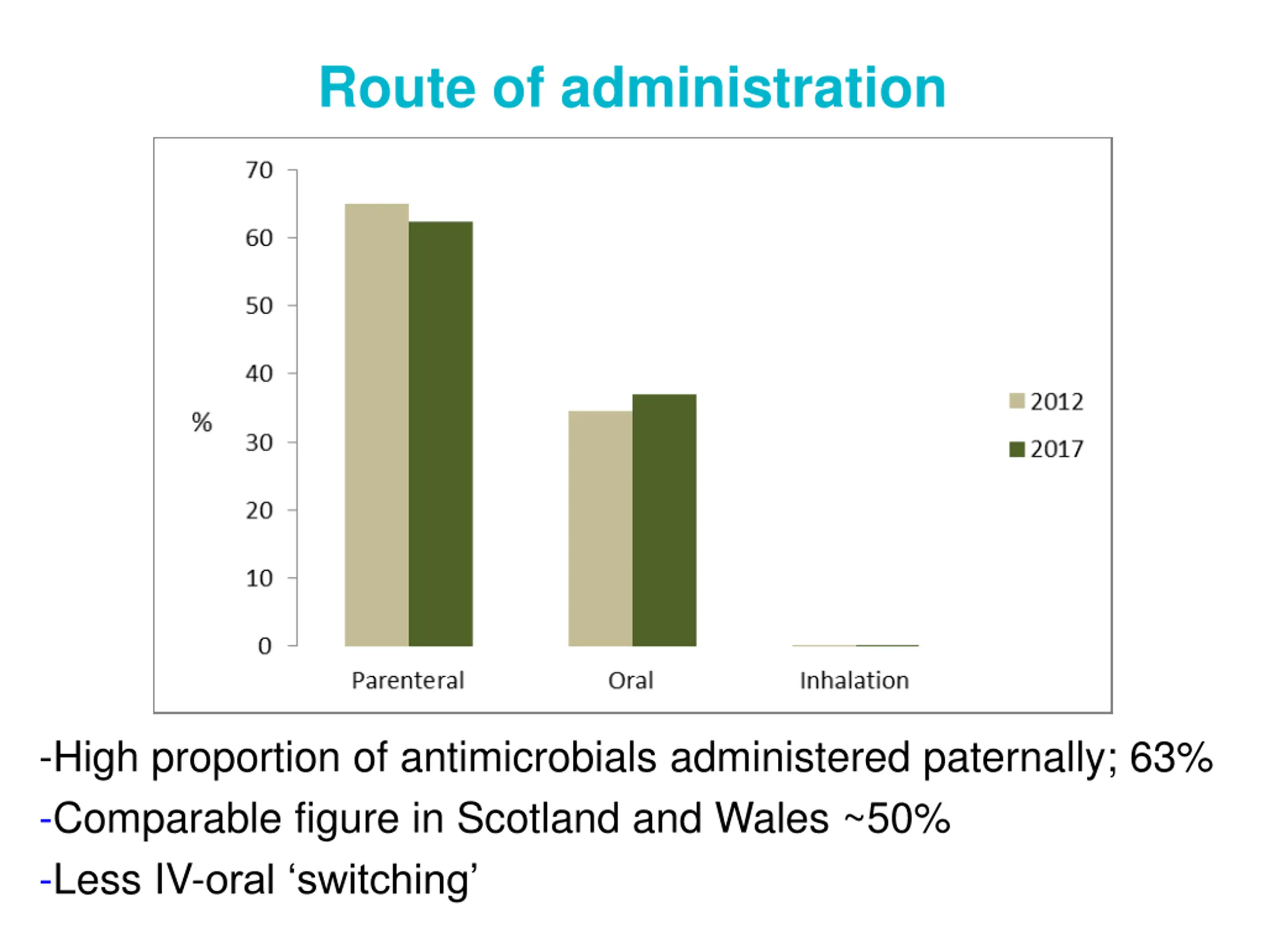 Route of administration -High proportion of antimicrobials administered paternally; 63% -Comparable figure in Scotland and Wales ~50% -Less IV-oral switching